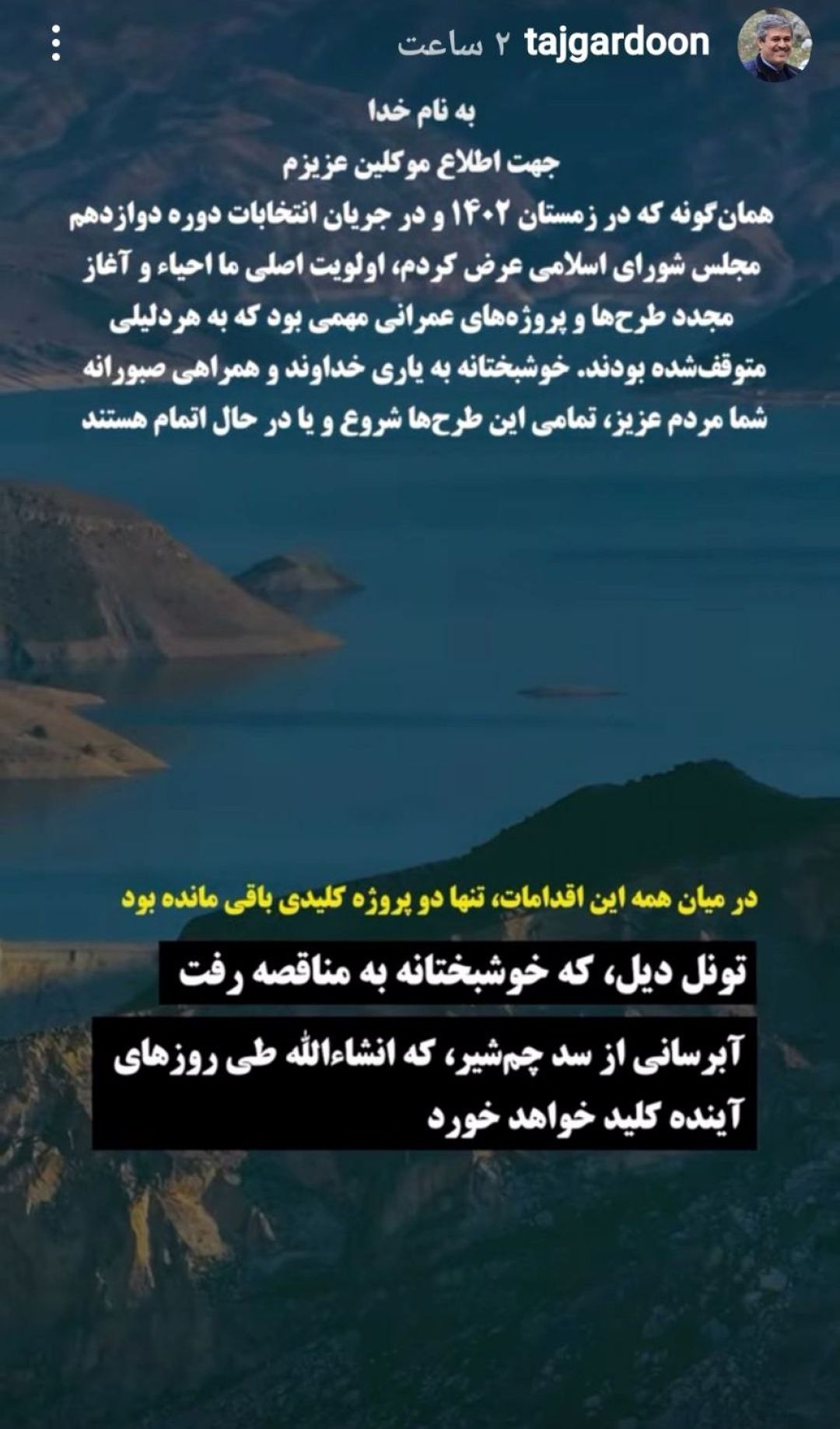 در میان همه این اقدامات تنها دو پروژه کلیدی باقی‌مانده بود؛ تونل دیل که خوشبختانه به مناقصه رفت. آب‌رسانی از سد چم‌شیر که ان‌شاءالله طی روزهای آینده کلید خواهد خورد.