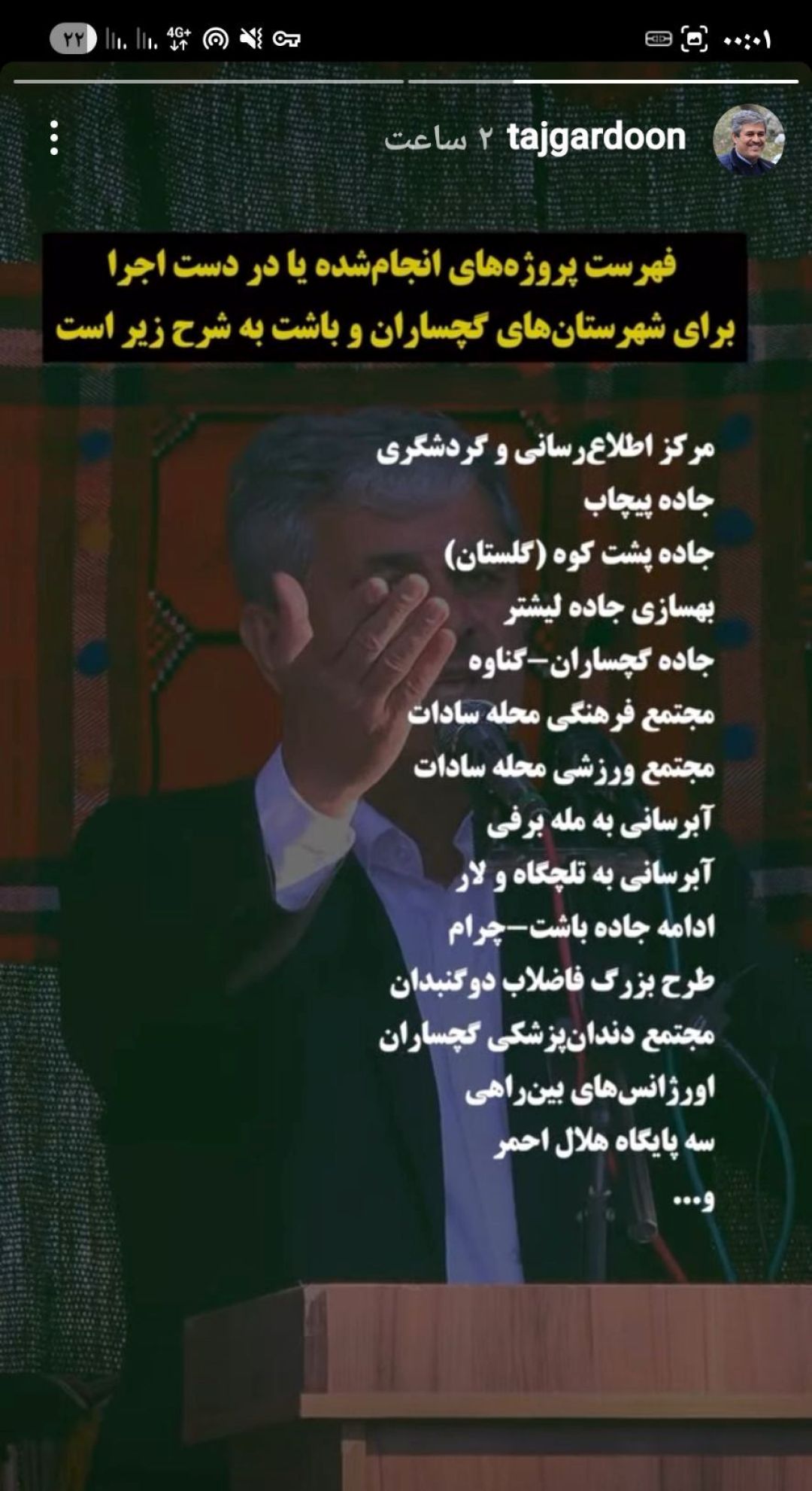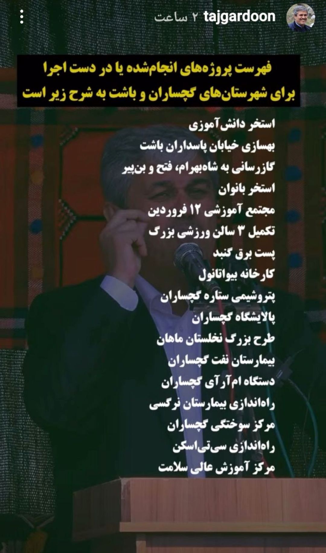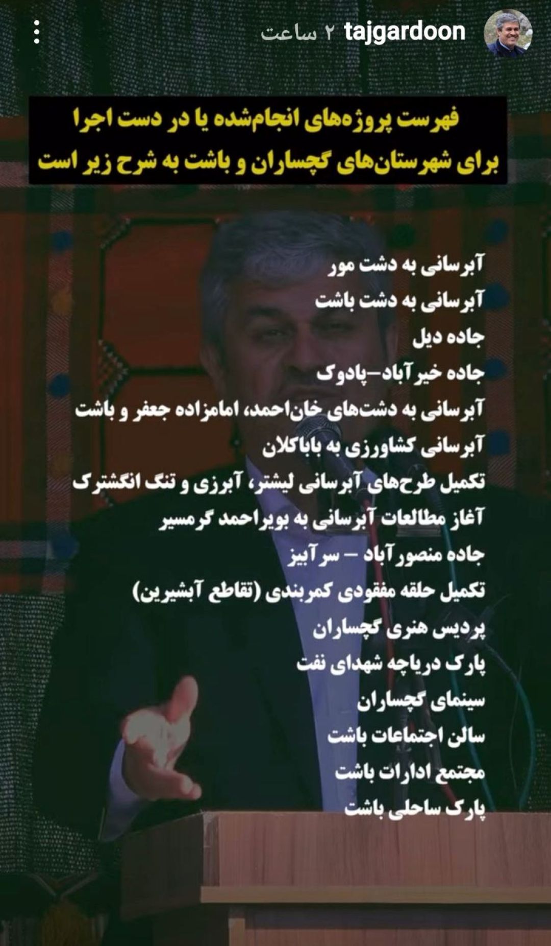 به گزارش پایگاه خبری تحلیلی «صبح زاگرس» غلامرضا تاجگردون نماینده گچساران و باشت در مجلس شورای اسلامی در صفحه مجازی‌اش در خصوص پروژه‌های حوزه انتخابیه‌اش نوشت: جهت اطلاع موکلین عزیز. همان‌گونه که در زمستان ۱۴۰۲ و در جریان انتخابات دوره دوازدهم مجلس شورای اسلامی عرض کردم اولویت اصلی ما احیاء و آغاز مجدد طرح‌ها و پروژه‌های عمرانی مهمی بود که به هر دلیلی متوقف‌شده بودند. خوشبختانه به یاری خداوند و همراهی صبورانه شما مردم عزیز تمامی این طرح‌ها شروع و یا در حال اتمام هستند.