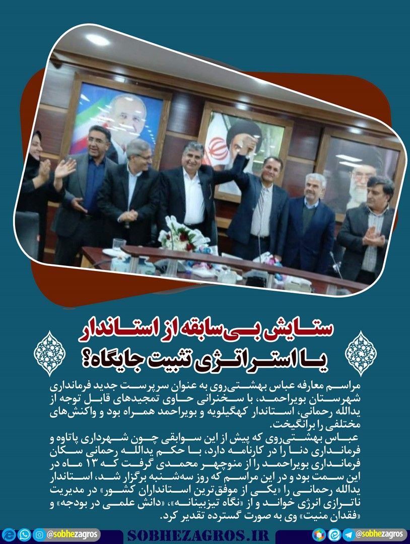به گزارش پایگاه خبری تحلیلی«صبحزاگرس»ستایش بیسابقه از استاندار یا استراتژی تثبیت جایگاه؟، آیا رحمانی میتواند جلوی «مافیای جمعهبازار» بایستد؟، هدیه رهبر انقلاب، آرامبخش زندگی ۱۵۰ زوج کهگیلویهوبویراحمدی،دادستان: سلامت انتخابات خط قرمز دستگاه قضایی است و بسیج سازندگی؛ بازوی توانمند خدمترسانی در مناطق محروم از جمله عکس نوشته های صبح زاگرس است.