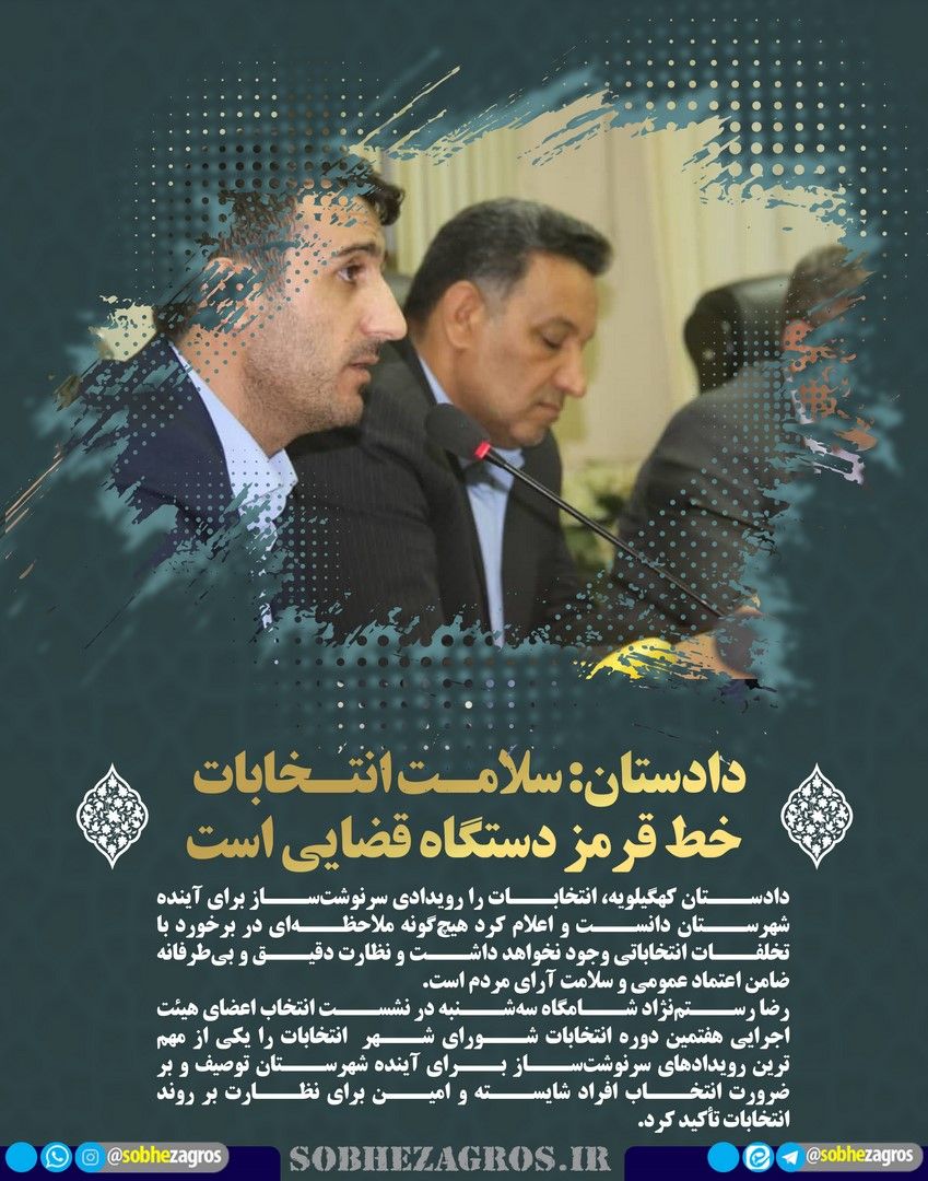 دادستان کهگیلویه، انتخابات را رویدادی سرنوشتساز برای آینده شهرستان دانست و اعلام کرد هیچگونه ملاحظهای در برخورد با تخلفات انتخاباتی وجود نخواهد داشت و نظارت دقیق و بیطرفانه ضامن اعتماد عمومی و سلامت آرای مردم است.(اینجا)