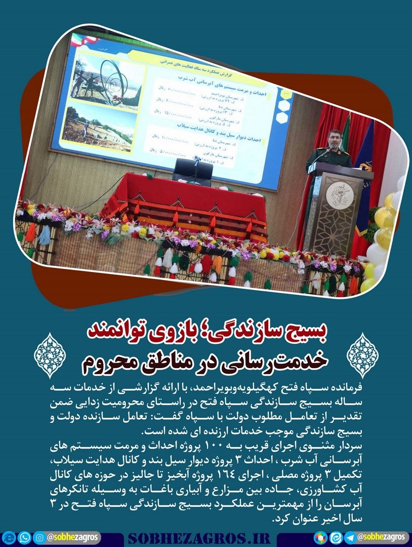 فرمانده سپاه فتح کهگیلویهوبویراحمد، با ارائه گزارشی از خدمات سه ساله بسیج سازندگی سپاه فتح در راستای محرومیت زدایی ضمن تقدیر از تعامل مطلوب دولت با سپاه گفت: تعامل سازنده دولت و بسیج سازندگی موجب خدمات ارزنده ای شده است(اینجا)
