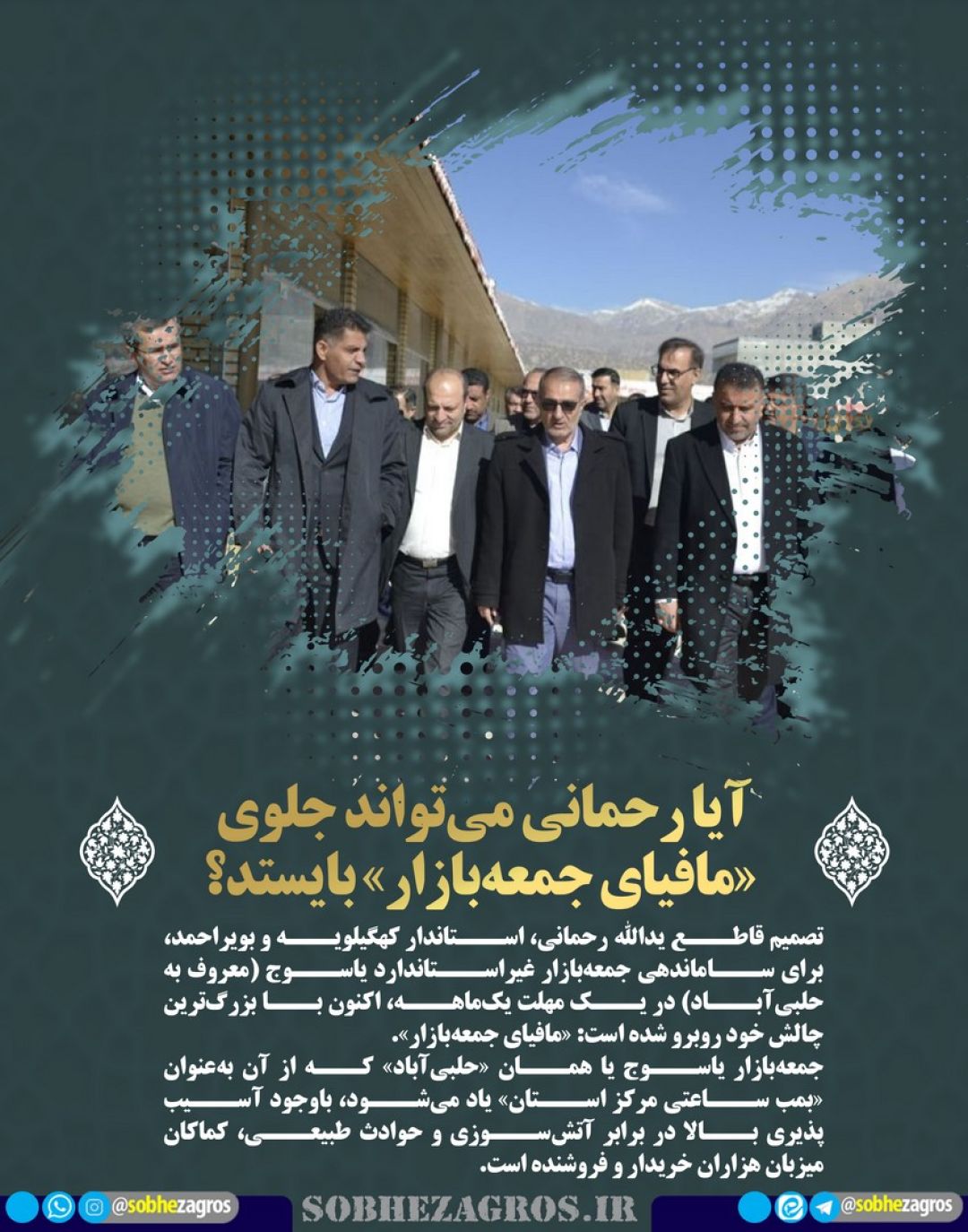 تصمیم قاطع یدالله رحمانی، استاندار کهگیلویه و بویراحمد، برای ساماندهی جمعهبازار غیراستاندارد یاسوج (معروف به حلبیآباد) در یک مهلت یکماهه، اکنون با بزرگترین چالش خود روبرو شده است: «مافیای جمعهبازار».(اینجا)