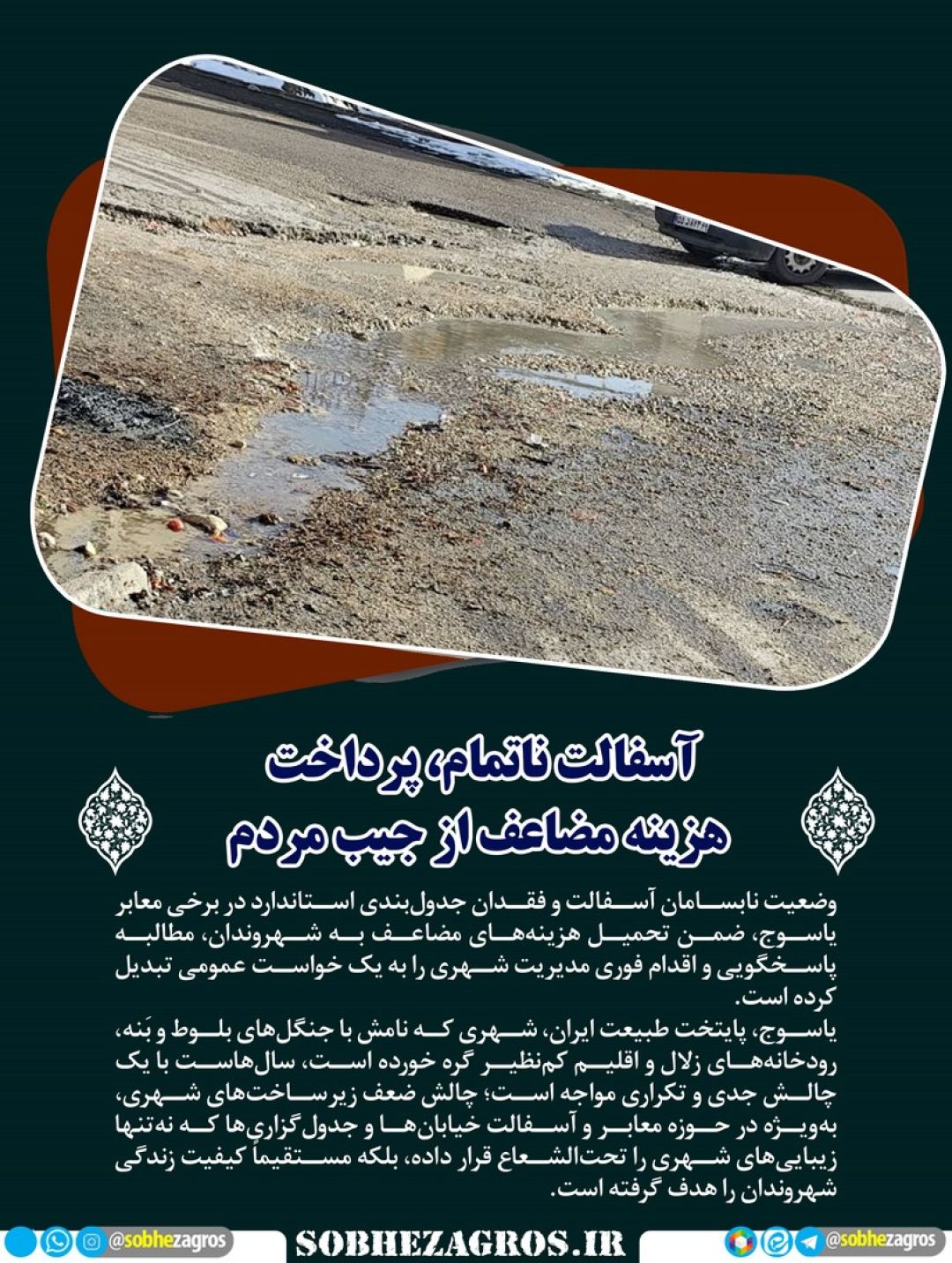 وضعیت نابسامان آسفالت و فقدان جدولبندی استاندارد در برخی معابر یاسوج، ضمن تحمیل هزینههای مضاعف به شهروندان، مطالبه پاسخگویی و اقدام فوری مدیریت شهری را به یک خواست عمومی تبدیل کرده است.(اینجا)