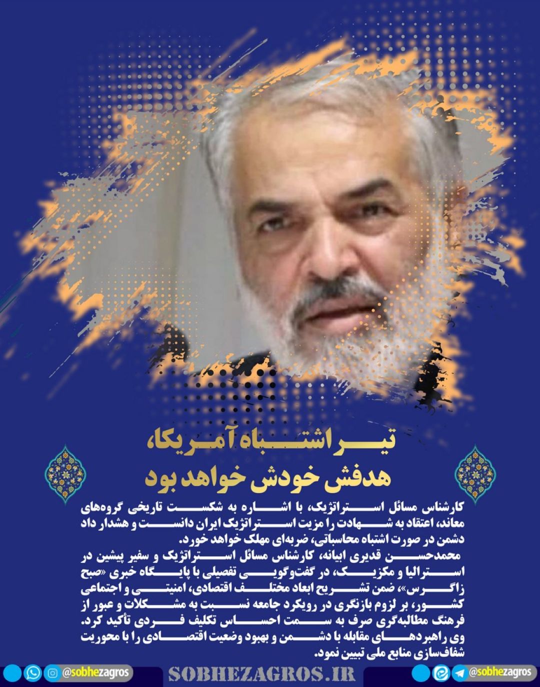 صبح زاگرس در این قسمت از عکس نوشتههای خود به تهدید کردن آمریکا توسط نماینده ولی فقیه در استان کهگیلویه و بویراحمد اختصاص داده شده است.