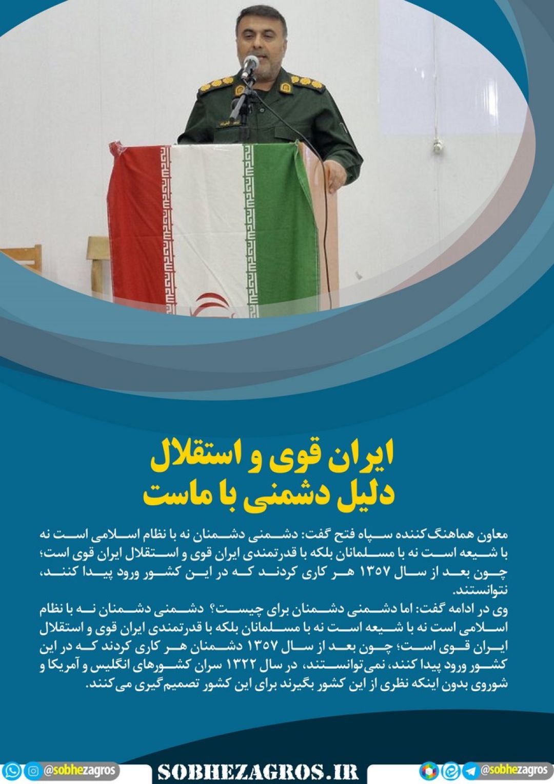 معاون هماهنگکننده سپاه فتح گفت: دشمنی دشمنان نه با نظام اسلامی است نه با شیعه است نه با مسلمانان بلکه با قدرتمندی ایران قوی و استقلال ایران قوی است؛ چون بعد از سال ۱۳۵۷ هر کاری کردند که در این کشور ورود پیدا کنند، نتوانستند.(اینجا)