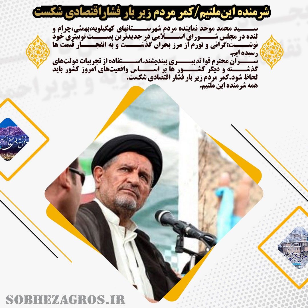 حجت الاسلام والمسلمین سید محمد موحد نماینده مردم شهرستانهای کهگیلویه،بهمئی،چرام و لنده در مجلس شورای اسلامی به وضعیت گرانی و تورم واکنش نشان داد.(اینجا)