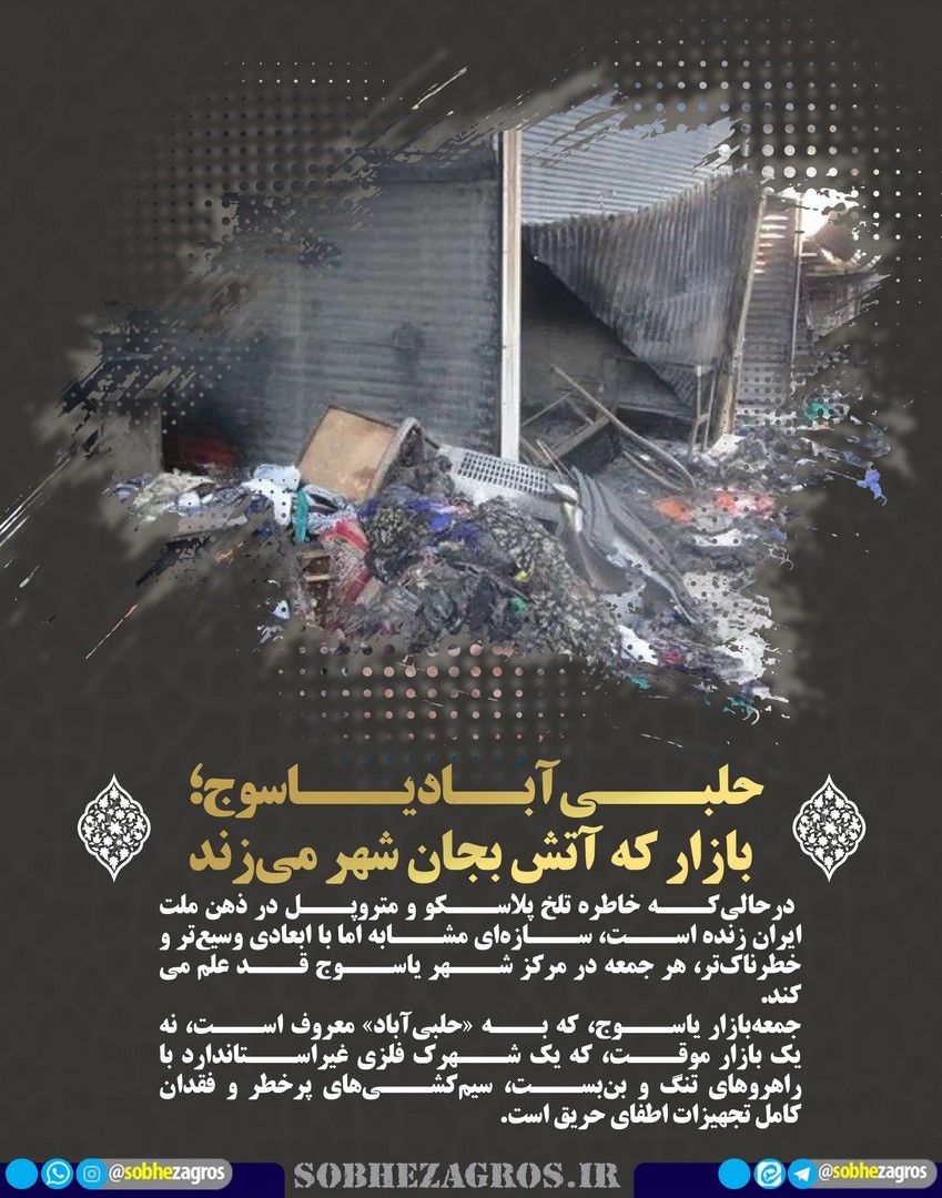 جمعهبازار یاسوج یا همان «حلبیآباد» که از آن بهعنوان «بمب ساعتی مرکز استان» یاد میشود، باوجود آسیبپذیری بالا در برابر آتشسوزی و حوادث طبیعی، کماکان میزبان هزاران خریدار و فروشنده است.(اینجا)