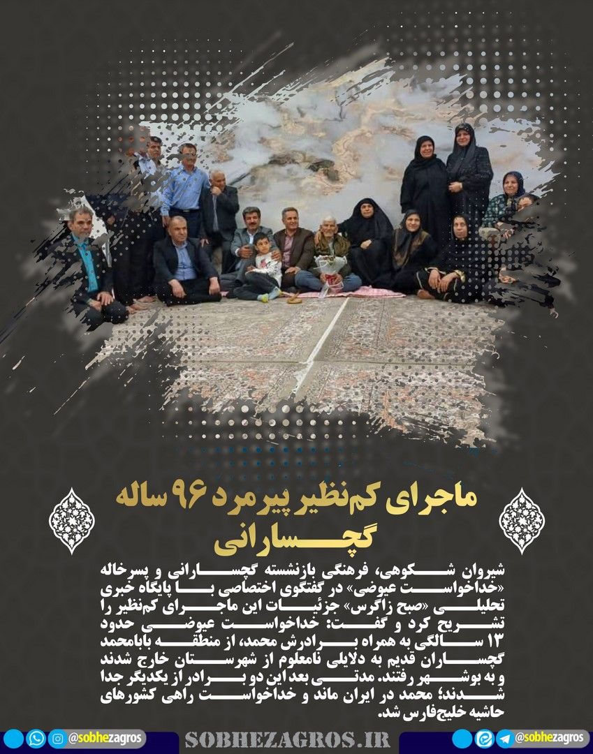 «خداخواست عیوضی» پیرمرد ۹۶ ساله گچسارانی که حدود 8 دهه پیش در نوجوانی از زادگاهش دورافتاده بود، سرانجام با پیگیریها و همت جمعی از دلسوزان، بار دیگر قدم به خاک گچساران گذاشت و با بستگان و خویشاوندانش دیدار کرد.(اینجا)