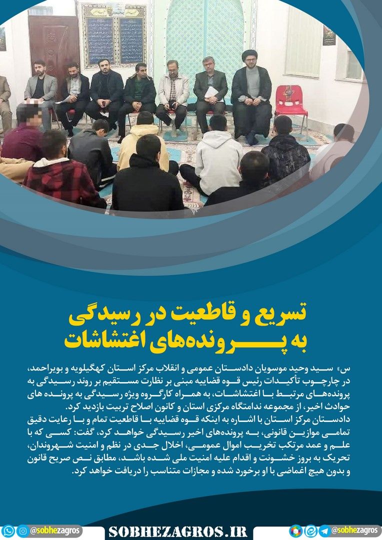 دادستان عمومی و انقلاب مرکز استان کهگیلویه و بویراحمد، در چارچوب تأکیدات رئیس قوه قضاییه مبنی بر نظارت مستقیم بر روند رسیدگی به پروندههای مرتبط با اغتشاشات؛ از مجموعه ندامتگاه مرکزی استان و کانون اصلاح تربیت بازدید کرد.(اینجا)