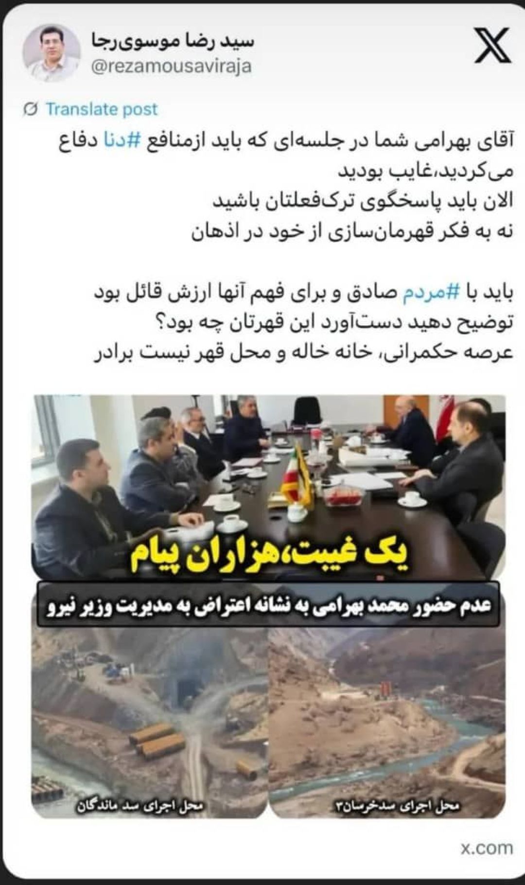 به گزارش پایگاه خبری تحلیلی «صبح زاگرس» سید رضا موسویرجا، از فعالان سیاسی و از حامیان سابق جریان «راه روشن فردا» در انتخابات ۱۴۰۲ و از نزدیکان پیشین محمد بهرامی، در واکنش به عدم حضور محمد بهرامی در جلسه دیدار با وزیر نیرو، مطلبی انتقادی در شبکه اجتماعی ایکس منتشر کرد.