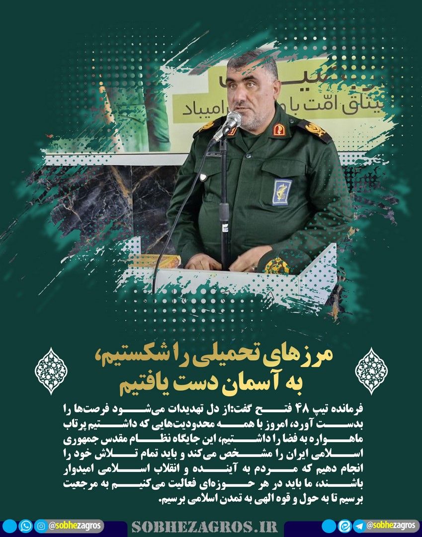 فرمانده تیپ ۴۸ فتح گفت: از دل تهدیدات میشود فرصتها را بدست آورد، امروز با همه محدودیتهایی که داشتیم پرتاب ماهواره به فضا را داشتیم، این جایگاه نظام مقدس جمهوری اسلامی ایران را مشخص میکند.(اینجا)