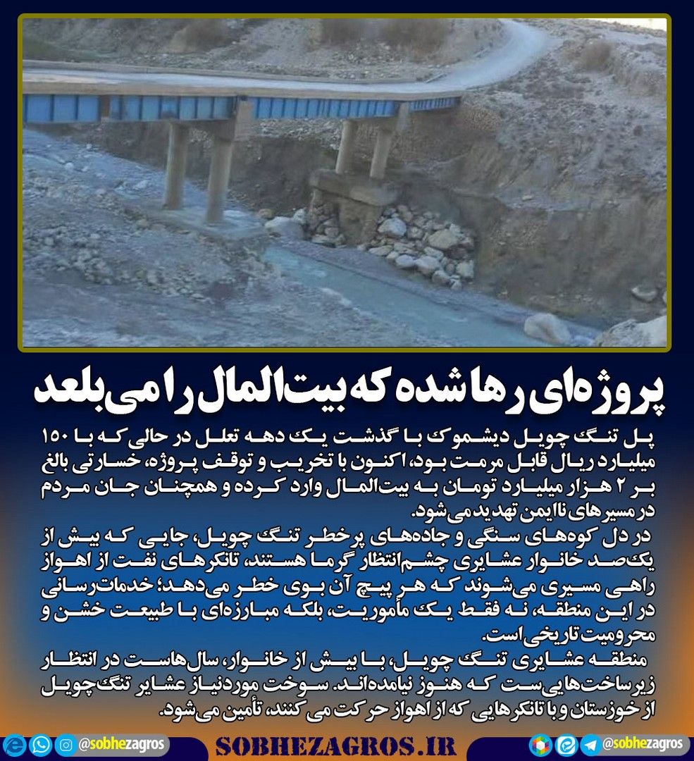 پل تنگ چویل دیشموک با گذشت یک دهه تعلل در حالیکه با ۱۵۰ میلیارد ریال قابل مرمت بود، اکنون با تخریب و توقف پروژه، خسارتی بالغ بر ۲ هزار میلیارد تومان به بیتالمال وارد کرده و همچنان جان مردم در مسیرهای ناایمن تهدید میشود.(اینجا)