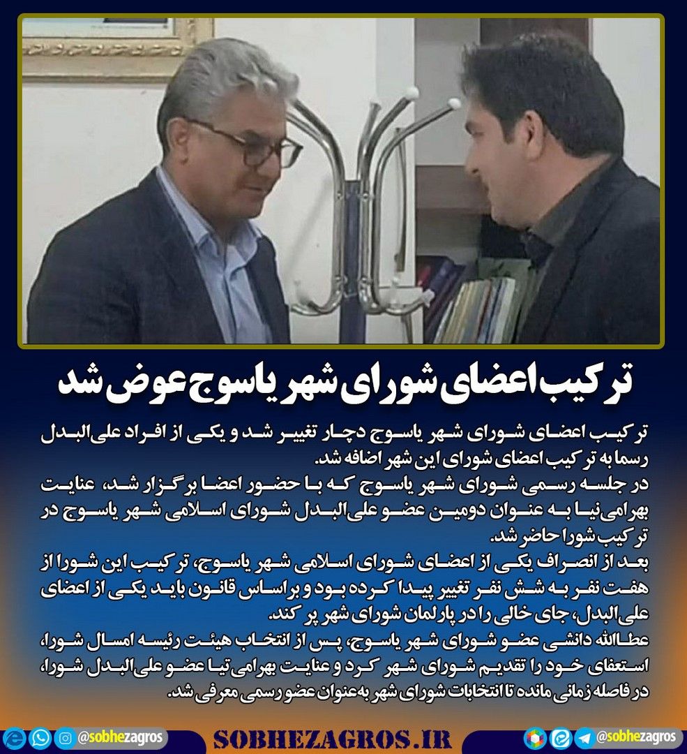 ترکیب اعضای شورای شهر یاسوج دچار تغییر شد و یکی از افراد علیالبدل رسما به ترکیب اعضای شورای این شهر اضافه شد.(اینجا)