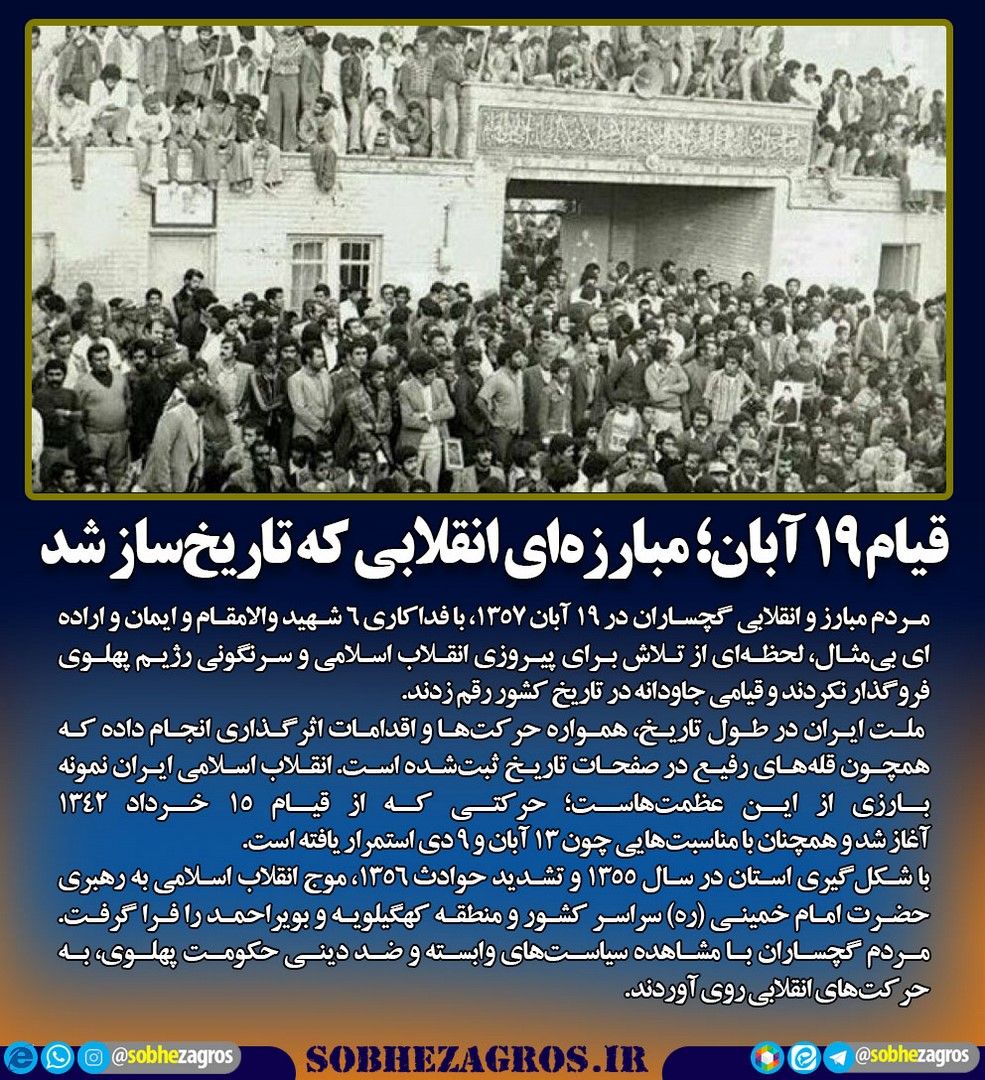 مردم مبارز و انقلابی گچساران در ۱۹ آبان ۱۳۵۷، با فداکاری 6 شهید والامقام و ایمان و ارادهای بیمثال، لحظهای از تلاش برای پیروزی انقلاب اسلامی و سرنگونی رژیم پهلوی فروگذار نکردند و قیامی جاودانه در تاریخ کشور رقم زدند.(اینجا)