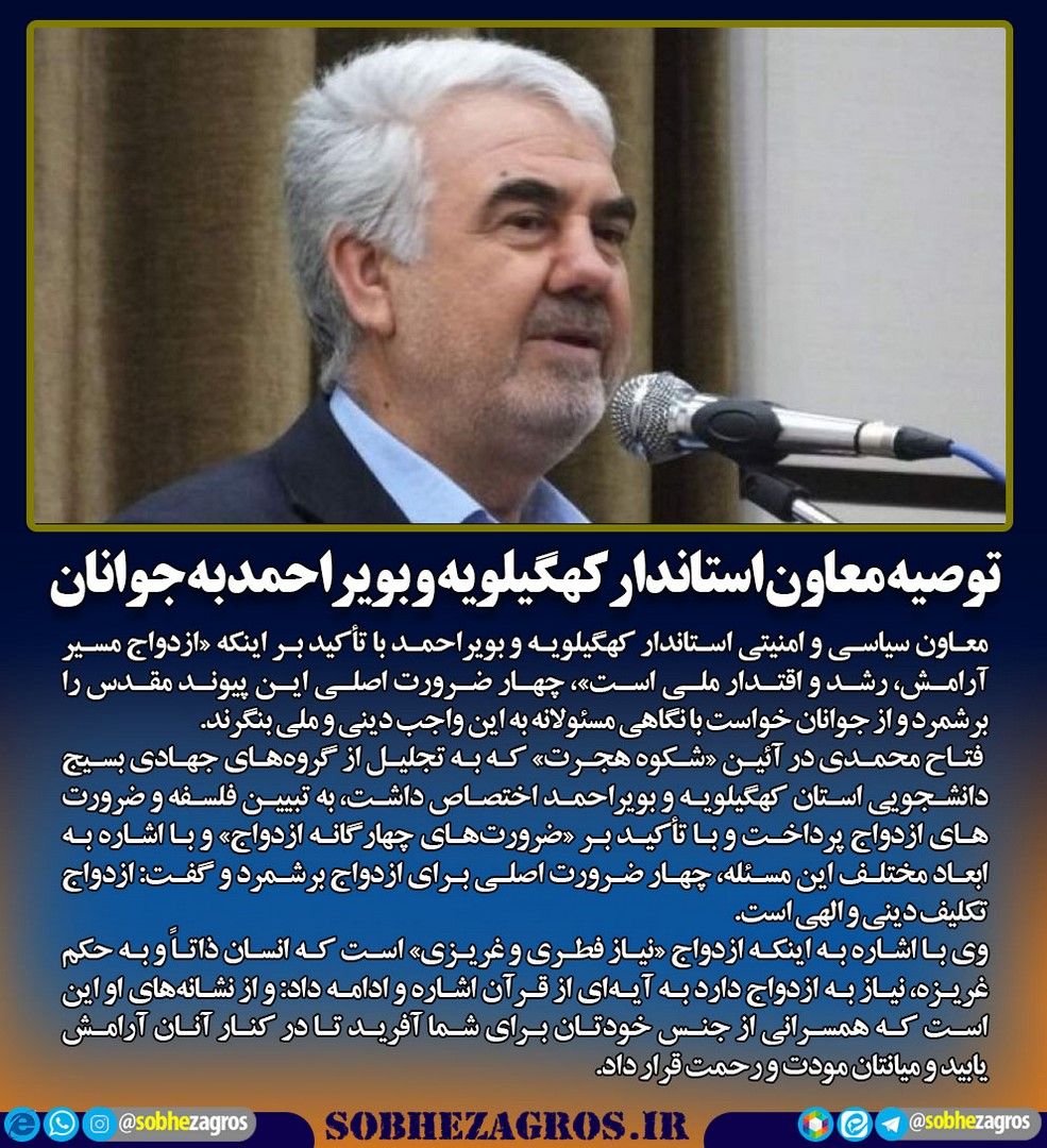 معاون سیاسی و امنیتی استاندار کهگیلویه و بویراحمد با تأکید بر اینکه «ازدواج مسیر آرامش، رشد و اقتدار ملی است»، چهار ضرورت اصلی این پیوند مقدس را برشمرد و از جوانان خواست با نگاهی مسئولانه به این واجب دینی و ملی بنگرند.(اینجا)