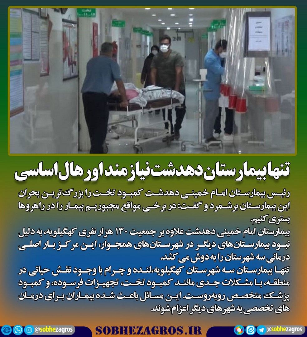رئیس بیمارستان امام خمینی دهدشت کمبود تخت را بزرگترین بحران این بیمارستان برشمرد و گفت: در برخی مواقع مجبوریم بیمار را در راهروها بستری کنیم.(اینجا)