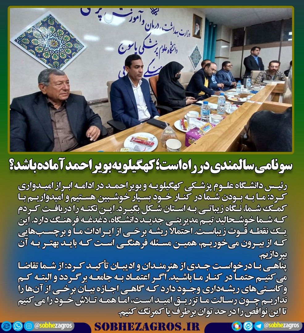 نشست رئیس دانشگاه علوم پزشکی کهگیلویه و بویراحمد با اصحاب ادب و هنر،سه محور اصلی «جوانی جمعیت»، «پزشکی خانواده» و «منع خشونت علیه کادر درمان» را مورد بحث و بررسی قرار داد.(اینجا)