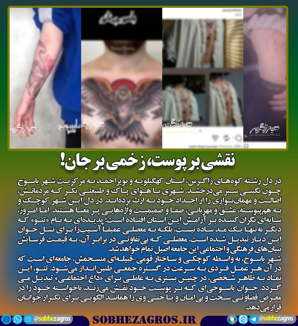 شهر یاسوج با بافت سنتی و مردمان اصیلش، این روزها شاهد روندی نگرانکننده از تزریق مرکب تتو بر پیکر جوانانش است، پدیدهای که پیامدهای فردی، اجتماعی و شرعی آن، آرامش این شهر کوهپایهای را نشانه رفته است.(اینجا)