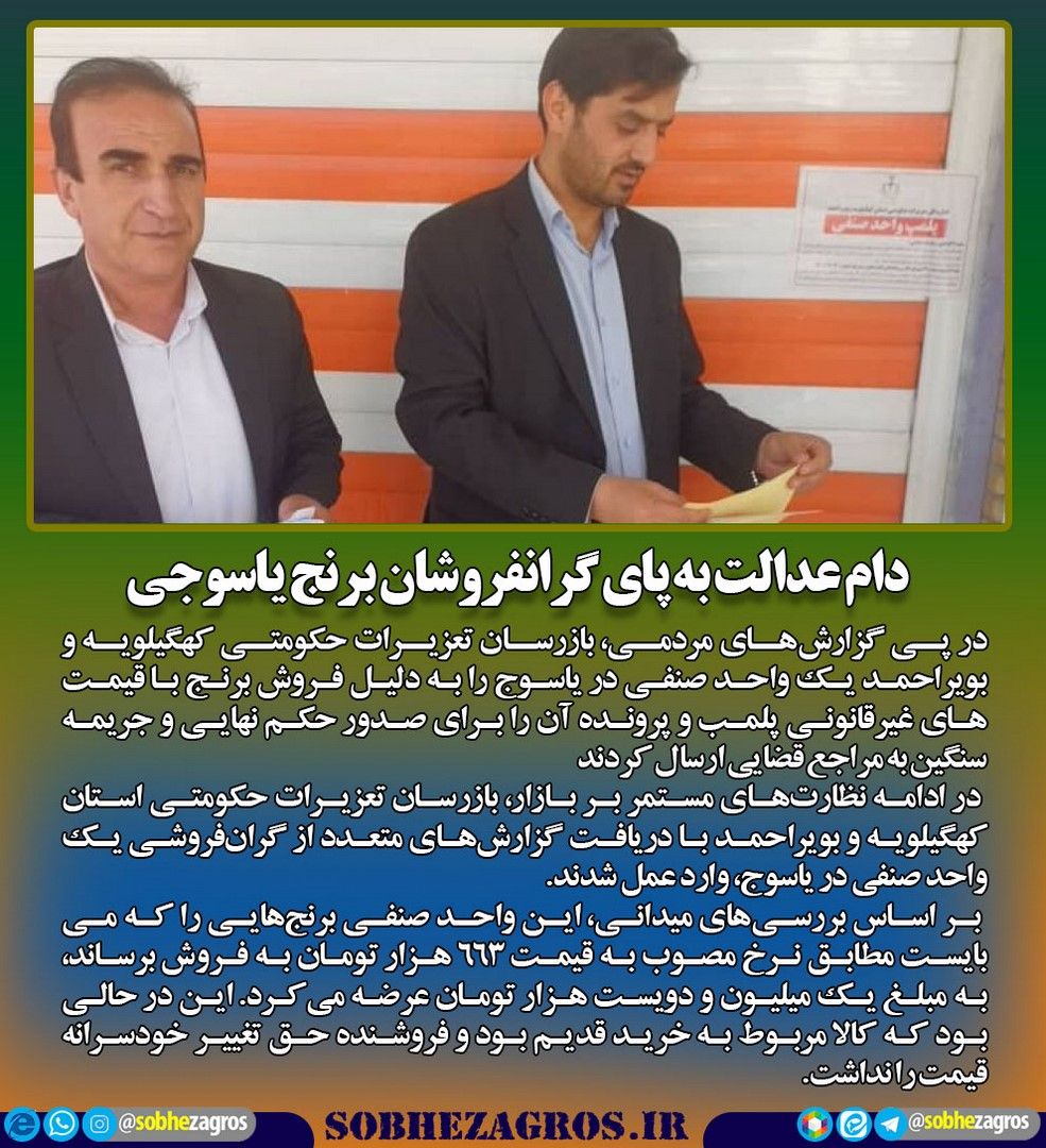 در پی گزارشهای مردمی، بازرسان تعزیرات حکومتی کهگیلویه و بویراحمد یک واحد صنفی در یاسوج را به دلیل فروش برنج با قیمتهای غیرقانونی پلمب و پرونده آن را برای صدور حکم نهایی و جریمه سنگین به مراجع قضایی ارسال کردند(اینجا)