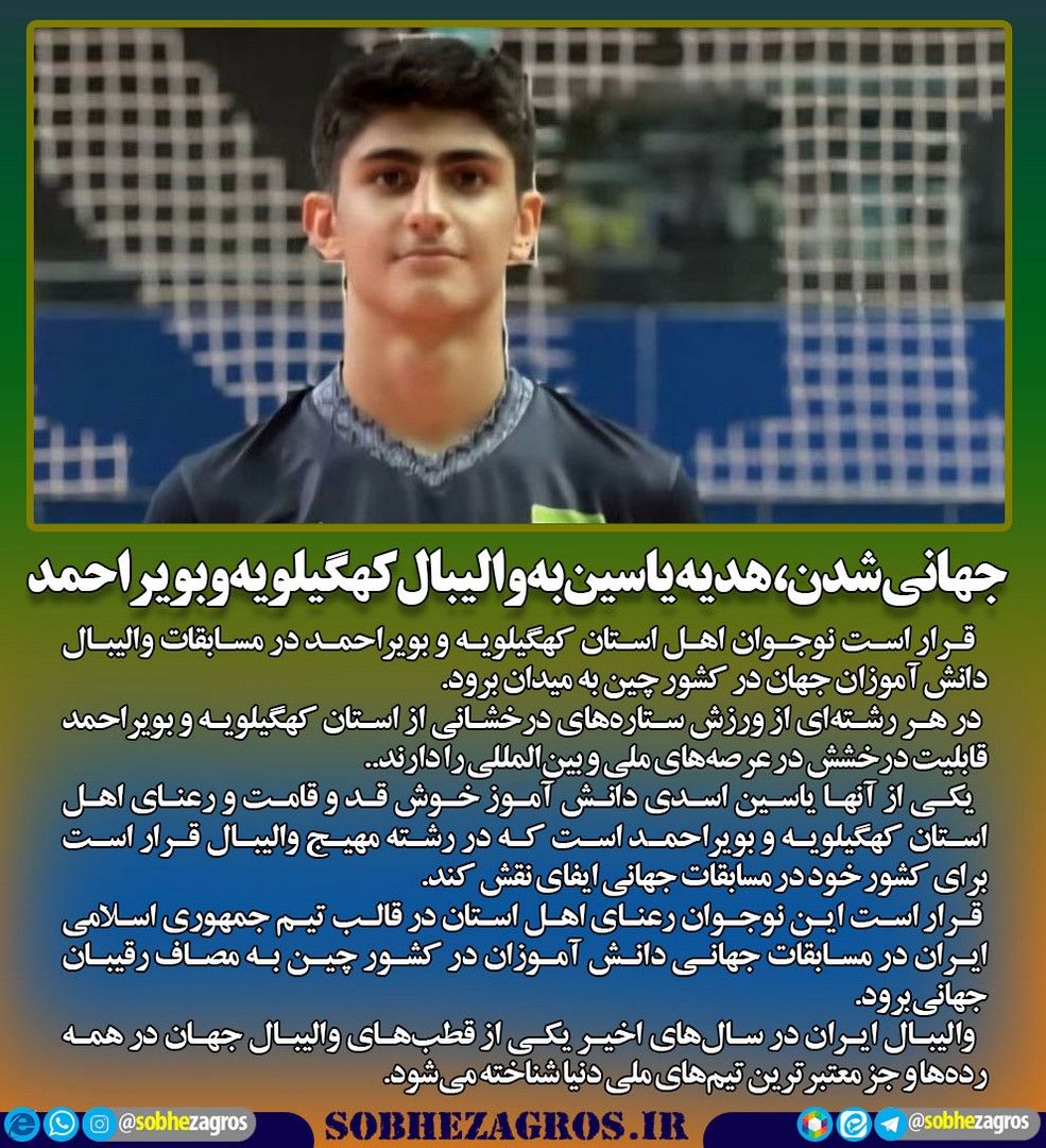 قرار است نوجوان اهل استان کهگیلویه و بویراحمد در مسابقات والیبال دانش آموزان جهان در کشور چین به میدان برود.(اینجا)