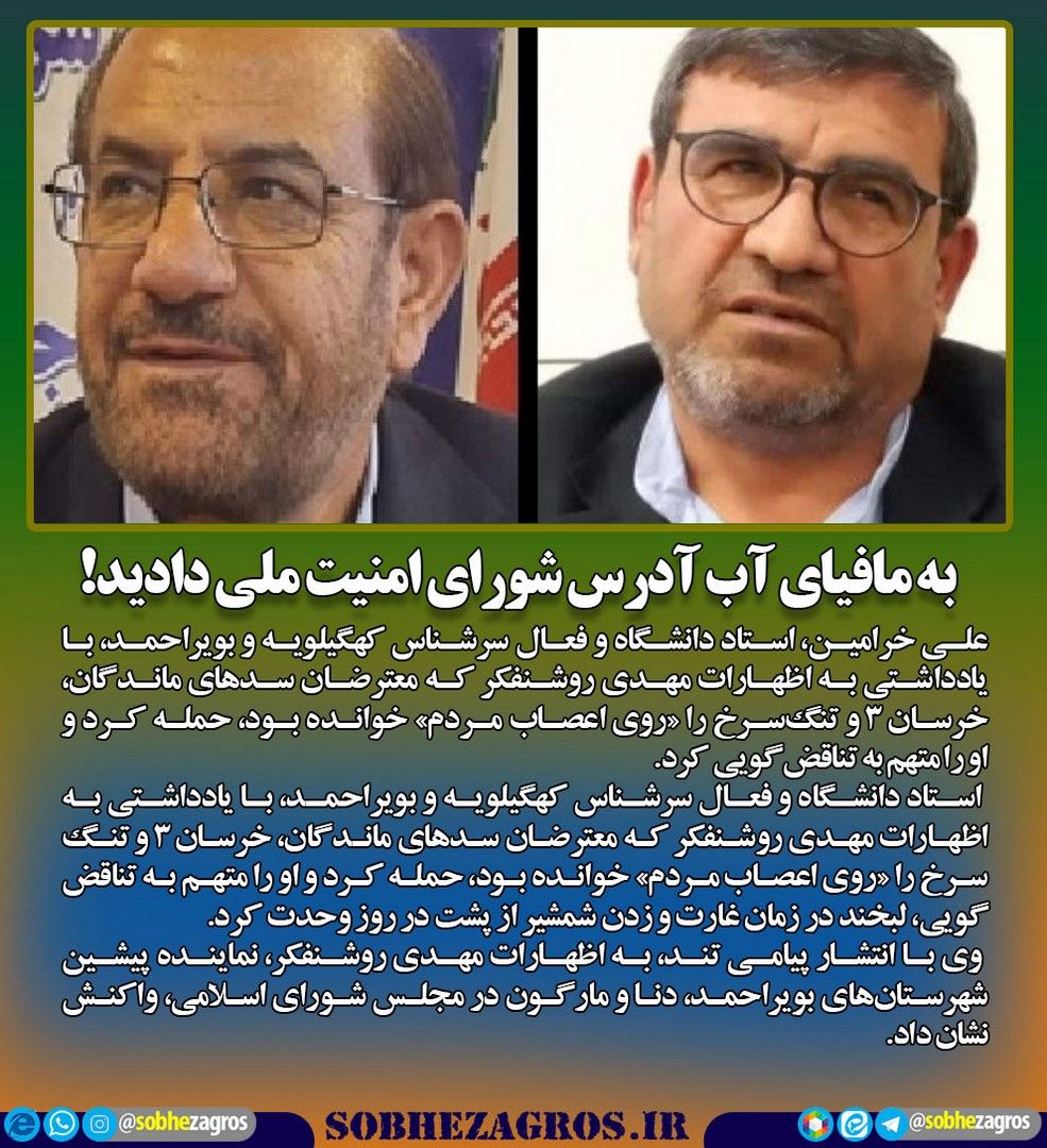 علی خرامین، استاد دانشگاه و فعال سرشناس کهگیلویه و بویراحمد، با یادداشتی به اظهارات مهدی روشنفکر که معترضان سدهای ماندگان، خرسان 3 و تنگسرخ را «روی اعصاب مردم» خوانده بود، حمله کرد و او را متهم به تناقضگویی کرد.(اینجا)