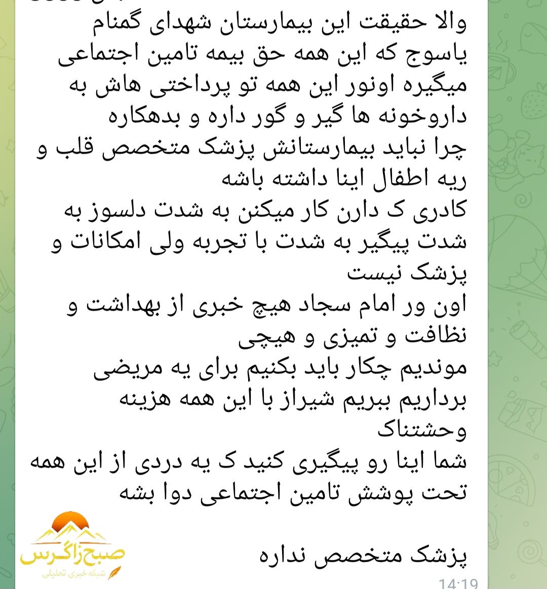 انتقاد از وضعیت بهداشت در بیمارستان امام سجاد (ع)