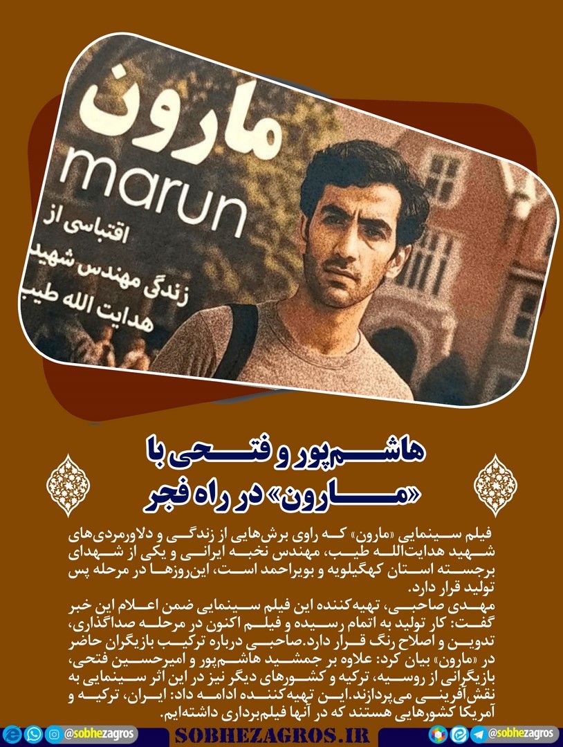 فیلم سینمایی «مارون» که راوی برشهایی از زندگی و دلاورمردیهای شهید هدایتالله طیب، مهندس نخبه ایرانی و یکی از شهدای برجسته استان کهگیلویه و بویراحمد است، اینروزها در مرحله پستولید قرار دارد.(اینجا)