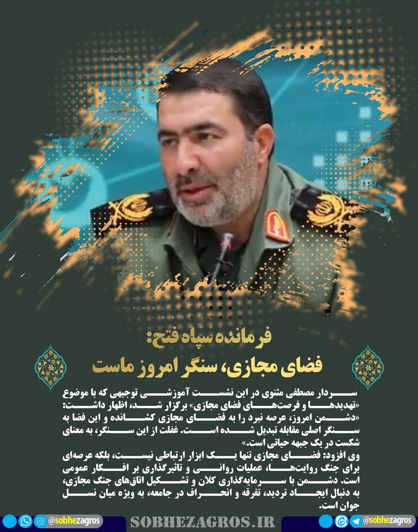 فرمانده سپاه فتح استان ، در نشستی با فعالان فضای مجازی ، بر لزوم حضور قوی، هوشمند و اثرگذار در این عرصه به عنوان یک «ماموریت استراتژیک» تأکید کرد.(اینجا)