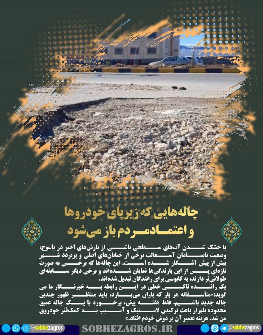 بارندگیهای اخیر در یاسوج، نه تنها طراوت را به هوای شهر بازگردانده، بلکه نقاب از چهرهای دیگر از معابر اصلی این شهر برداشته است چالههای عمیق و پرتعدادی که به گفته شهروندان و رانندگان، خسارتهای مالی به خودروها وارد میکنند.(اینجا)