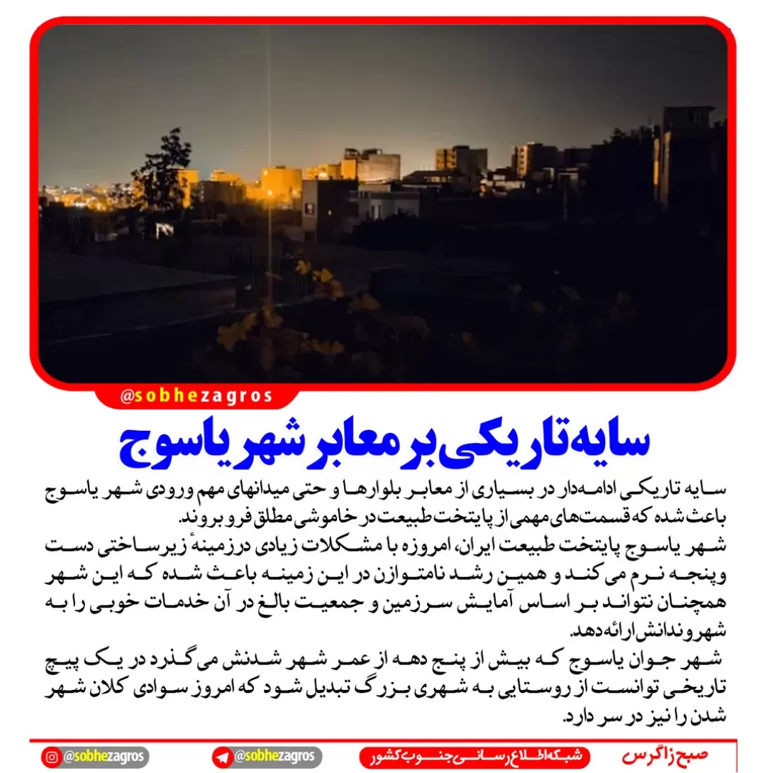 صبح زاگرس در این قسمت از عکس نوشته های خود به سایه شوم تاریکی بر معابر شهر یاسوج و عدم ساماندهی این موضوع اختصاص داده شده است.