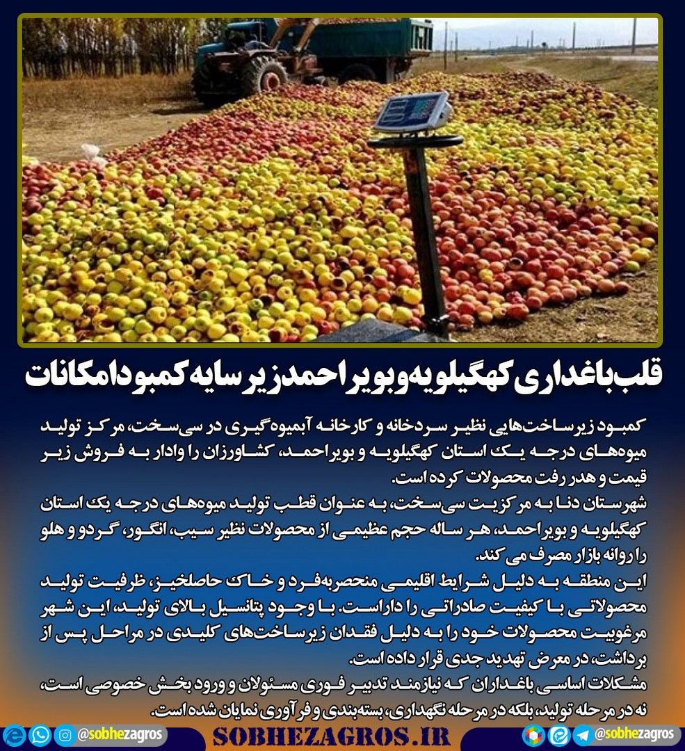 کمبود زیرساختهایی نظیر سردخانه و کارخانه آبمیوهگیری در سیسخت، مرکز تولید میوههای درجه یک استان کهگیلویه و بویراحمد، کشاورزان را وادار به فروش زیر قیمت و هدر رفت محصولات کرده است.(اینجا)