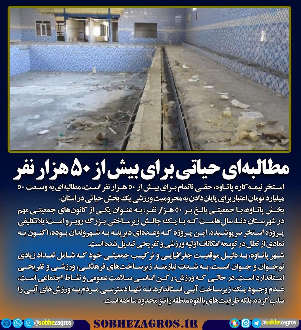 استخر نیمهکاره پاتاوه، حقی ناتمام برای بیش از ۵۰ هزار نفر است، مطالبهای به وسعت ۵۰ میلیارد تومان اعتبار برای پایاندادن به محرومیت ورزشی یک بخش حیاتی در استان.(اینجا)