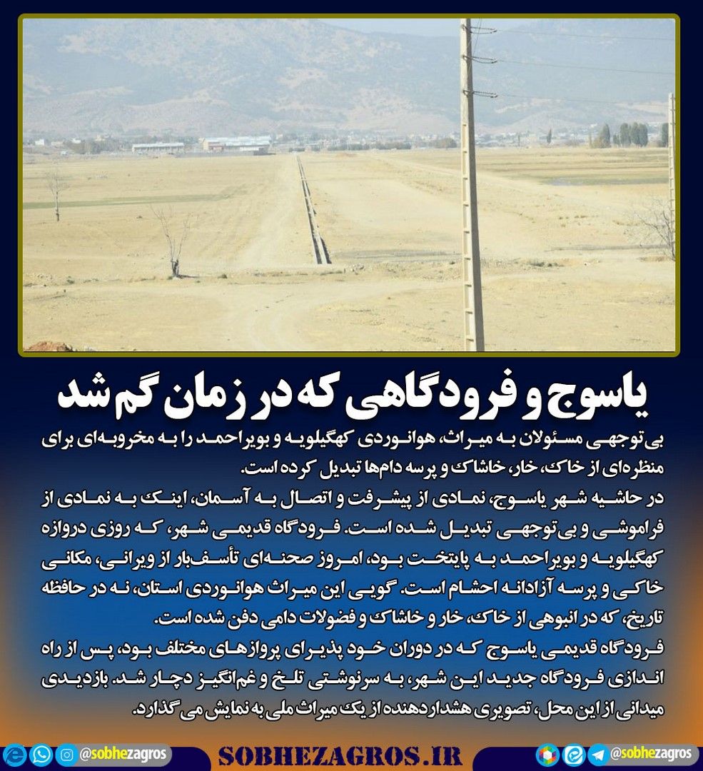بیتوجهی مسئولان به میراث، هوانوردی کهگیلویه و بویراحمد را به مخروبهای برای منظرهای از خاک، خار، خاشاک و پرسه دامها تبدیل کرده است.(اینجا)