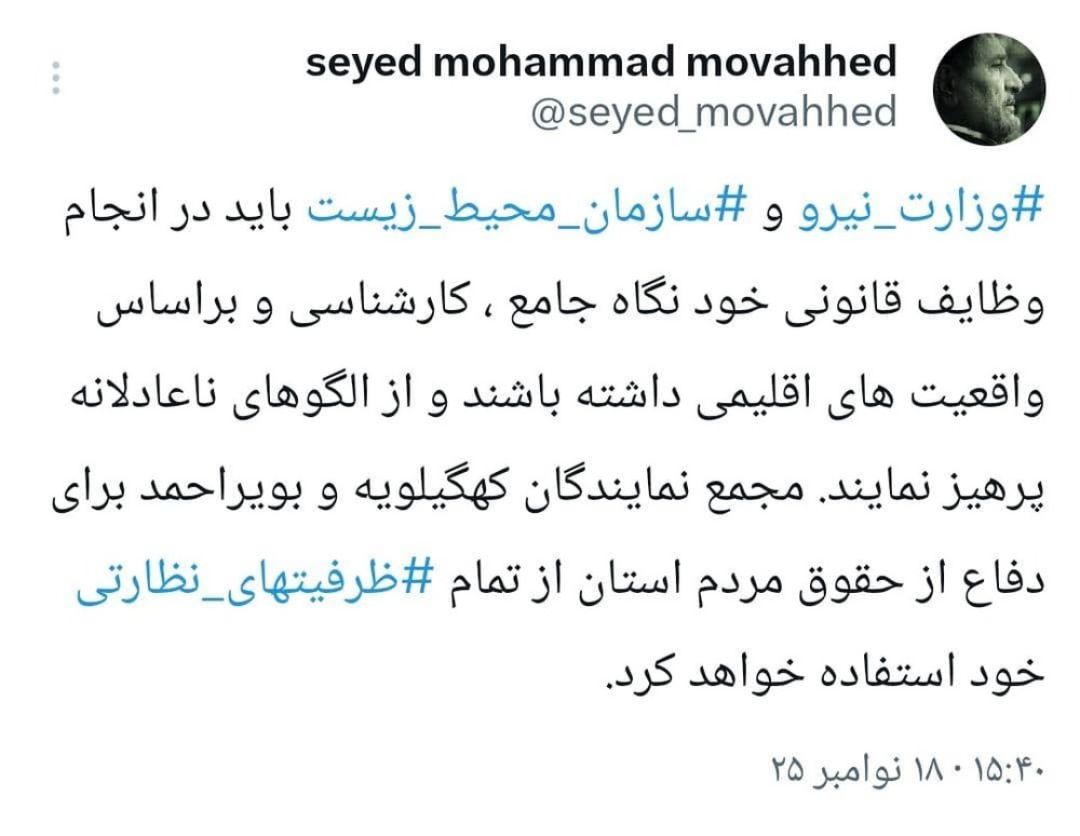 وی در بخشی از این بیانیه تأکید کرد: «وزارت نیرو و سازمان محیط زیست باید در انجام وظایف قانونی خود نگاه جامع، کارشناسی و براساس واقعیتهای اقلیمی داشته باشند و از الگوهای ناعادلانه پرهیز نمایند.»