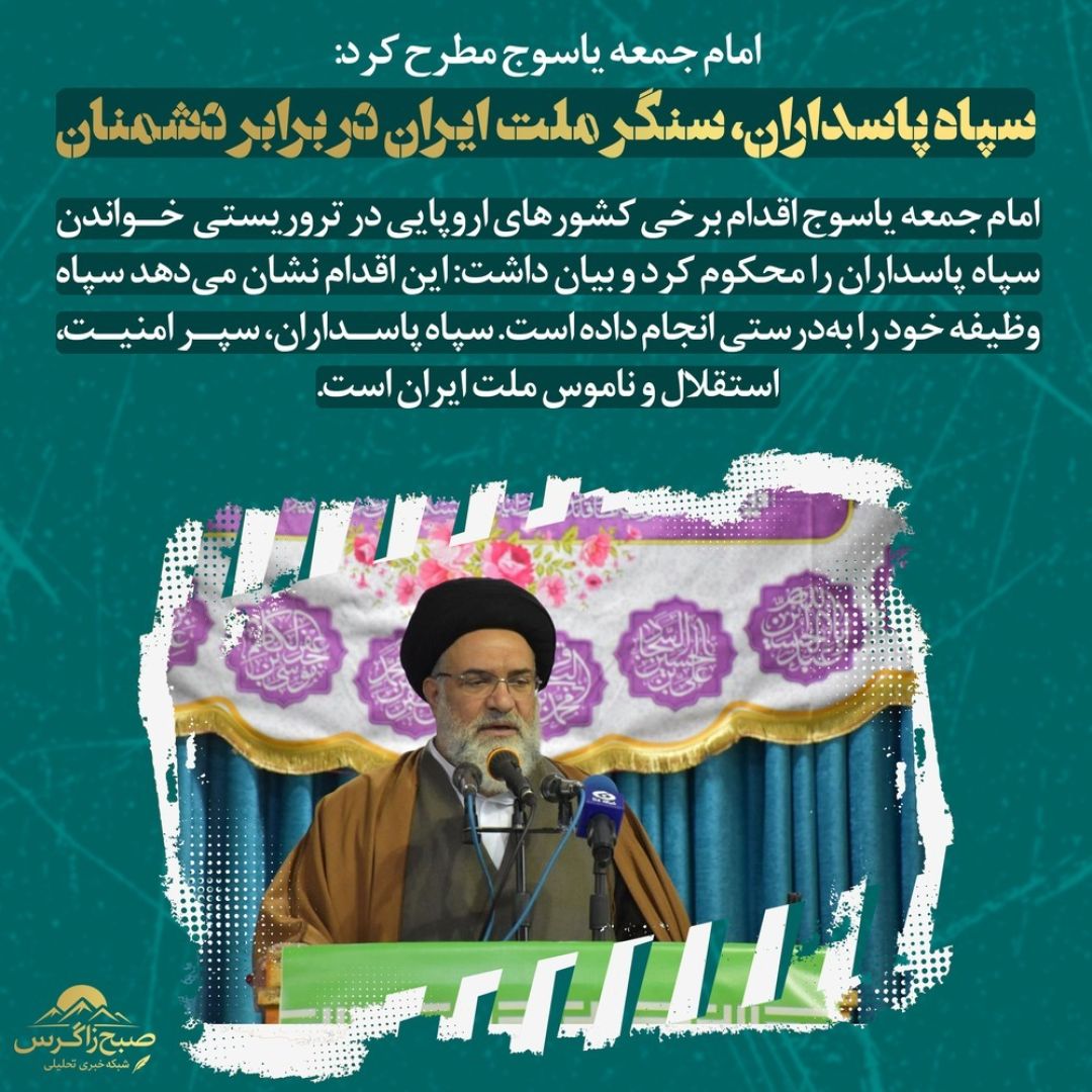 امام جمعه یاسوج اقدام برخی کشورهای اروپایی در تروریستی خواندن سپاه پاسداران را محکوم کرد و بیان داشت: این اقدام نشان میدهد سپاه وظیفه خود را بهدرستی انجام داده است. سپاه پاسداران، سپر امنیت، استقلال و ناموس ملت ایران است.(اینجا)