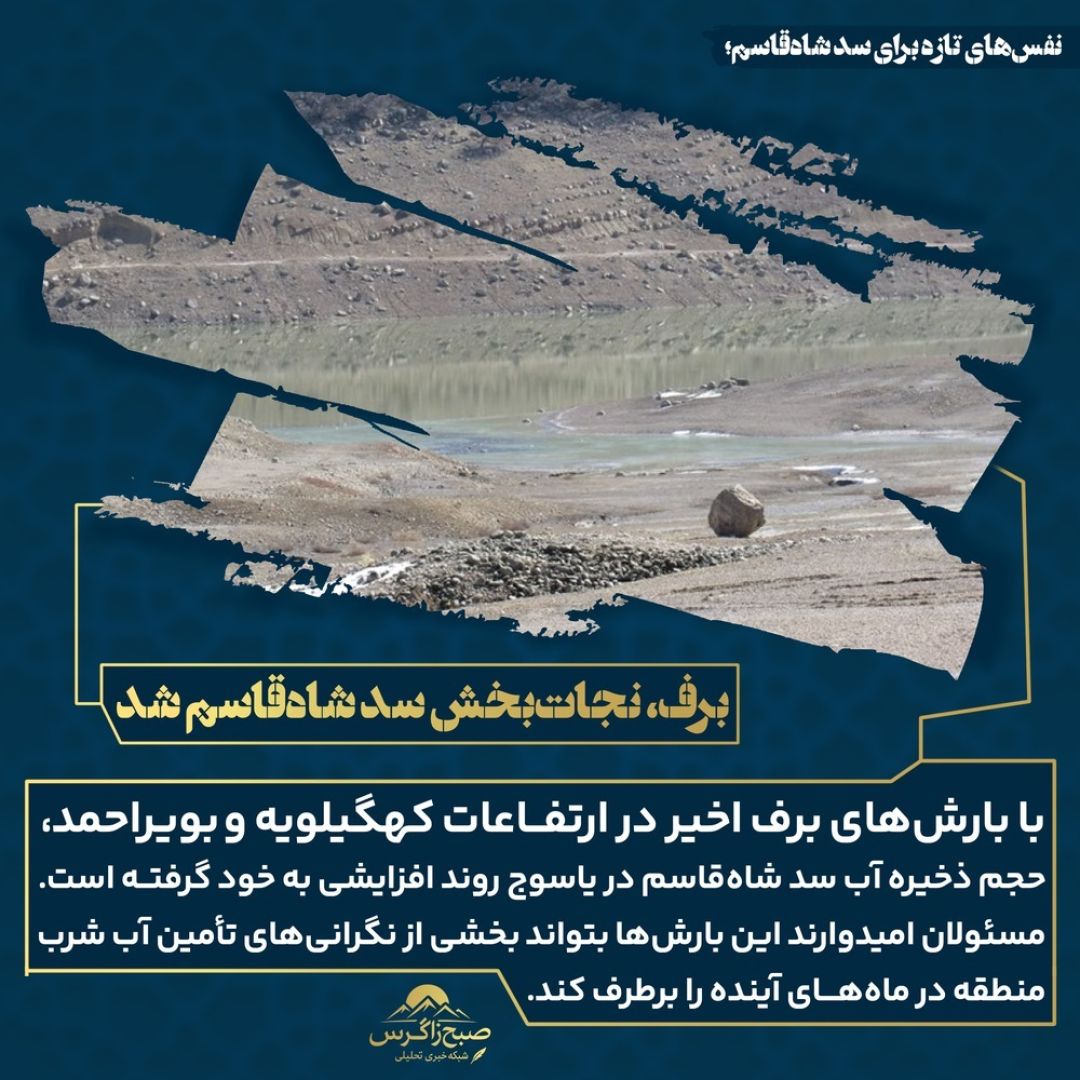 با بارشهای برف اخیر در ارتفاعات کهگیلویه و بویراحمد، حجم ذخیره آب سد شاهقاسم در یاسوج روند افزایشی به خود گرفته است. مسئولان امیدوارند این بارشها بتواند بخشی از نگرانیهای تأمین آب شرب منطقه در ماههای آینده را برطرف کند.(اینجا)
