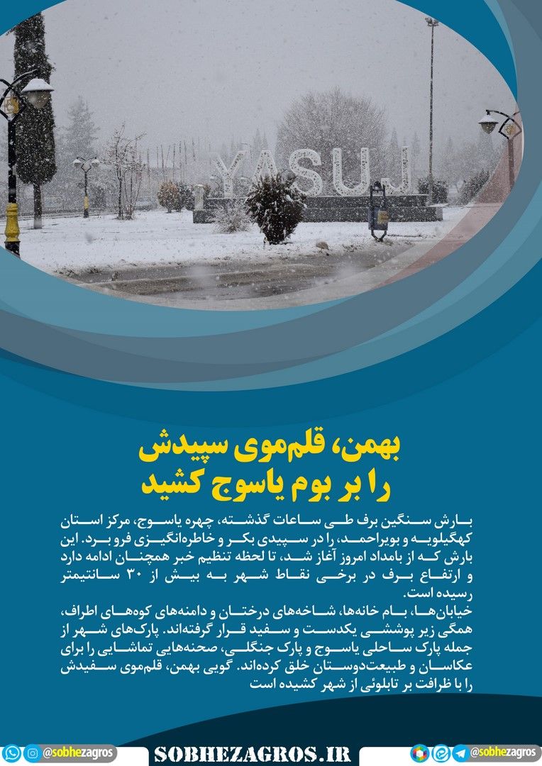 بارش سنگین برف طی ساعات گذشته، چهره یاسوج، مرکز استان کهگیلویه و بویراحمد، را در سپیدی بکر و خاطرهانگیزی فرو برد.(اینجا)