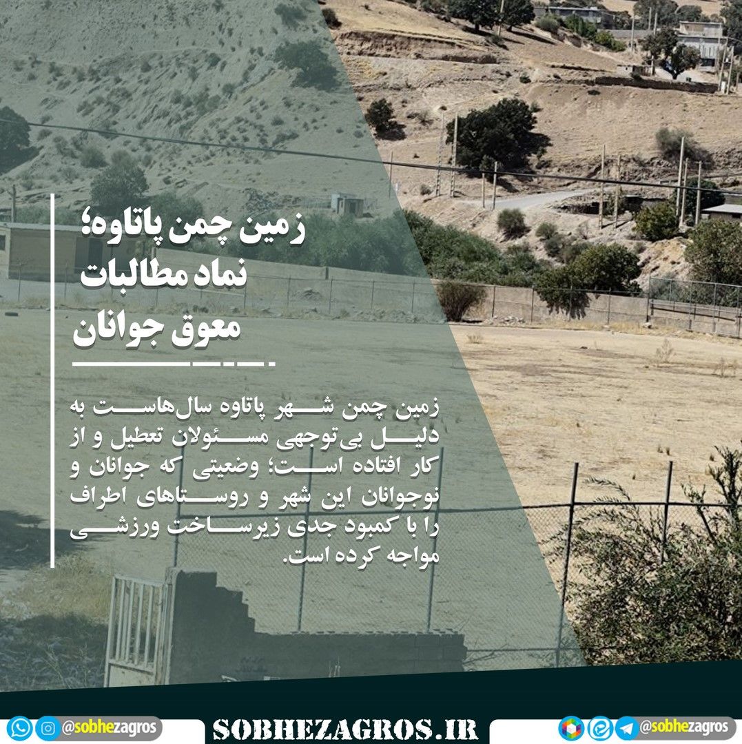 زمین چمن شهر پاتاوه سالهاست بهدلیل بیتوجهی مسئولان تعطیل و از کار افتاده است؛ وضعیتی که جوانان و نوجوانان این شهر و روستاهای اطراف را با کمبود جدی زیرساخت ورزشی مواجه کرده است.(اینجا)