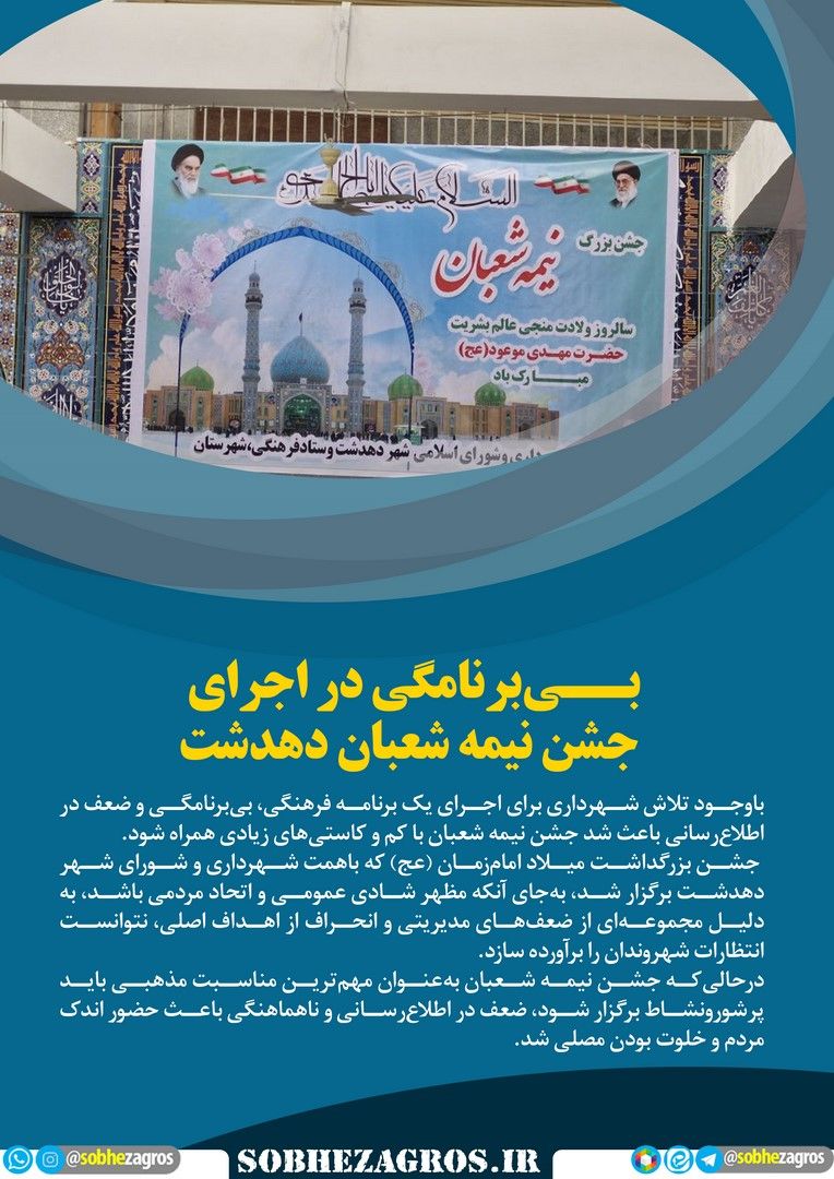 باوجود تلاش شهرداری برای اجرای یک برنامه فرهنگی، بیبرنامگی و ضعف در اطلاعرسانی باعث شد جشن نیمه شعبان با کم و کاستیهای زیادی همراه شود.(اینجا)