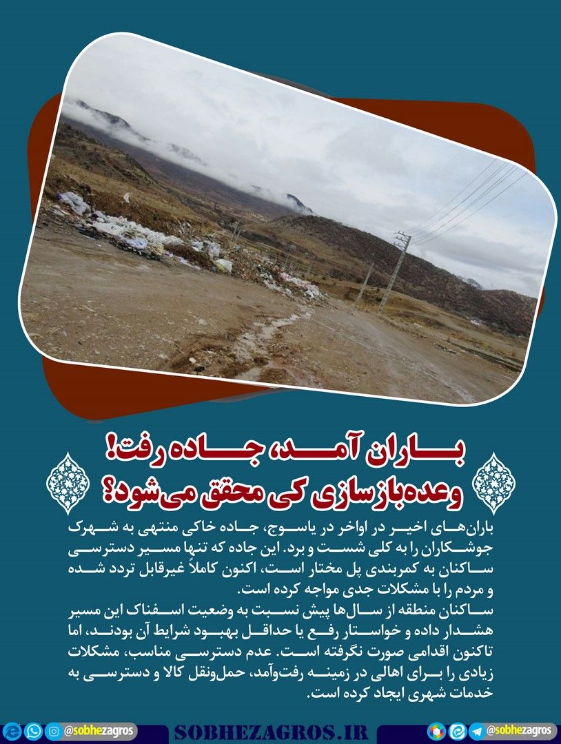 بارانهای اخیر در اواخر در یاسوج، جاده خاکی منتهی به شهرک جوشکاران را به کلی شست و برد. این جاده که تنها مسیر دسترسی ساکنان به کمربندی پل مختار است، اکنون کاملاً غیرقابل تردد شده و مردم را با مشکلات جدی مواجه کرده است.(اینجا)