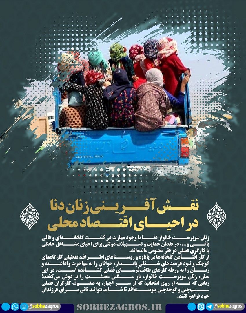 زنان سرپرست خانوار دنا با وجود مهارت در کشت گلخانهای و قالیبافی و...، در فقدان حمایت و تسهیلات دولتی برای احیای مشاغل خانگی با کارگری فصلی در فقر محبوس ماندهاند.(اینجا)