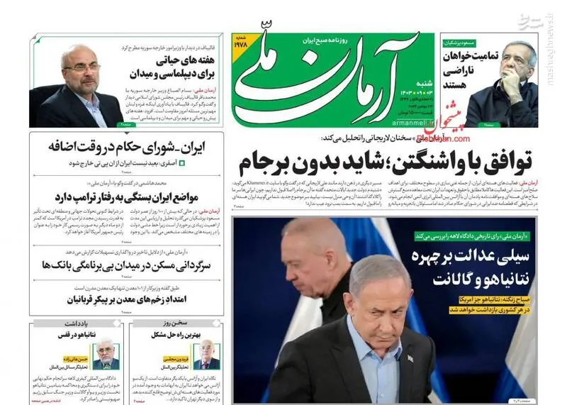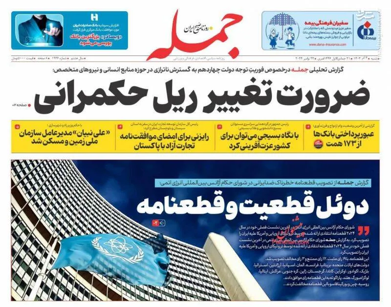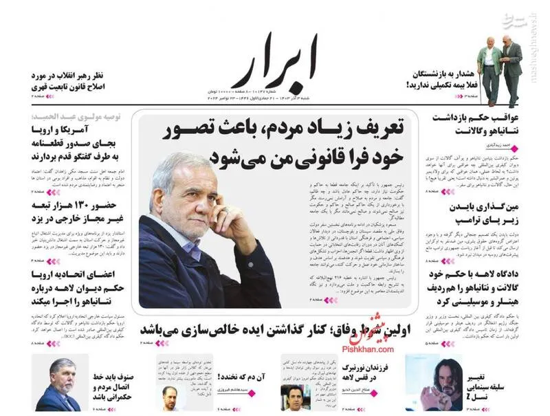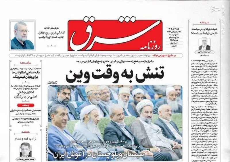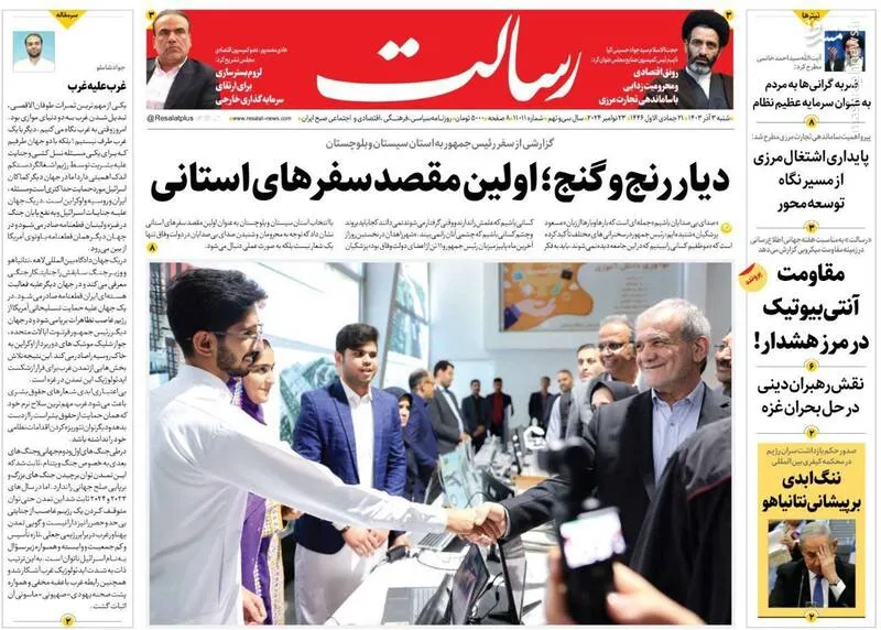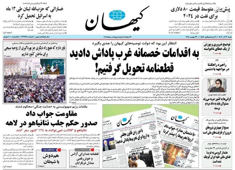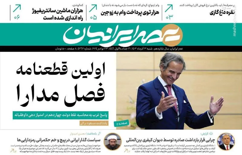 به اقدامات خصمانه غرب پاداش دادید قطعنامه تحویل گرفتیم!، اعتبار ۱۲۴ هزار میلیاردی برای توسعه سیستان و بلوچستان، بازی باخته آژانس، تیتر برخی از روزنامههای شنبه سوم آذرماه ۱۴۰۳ است.