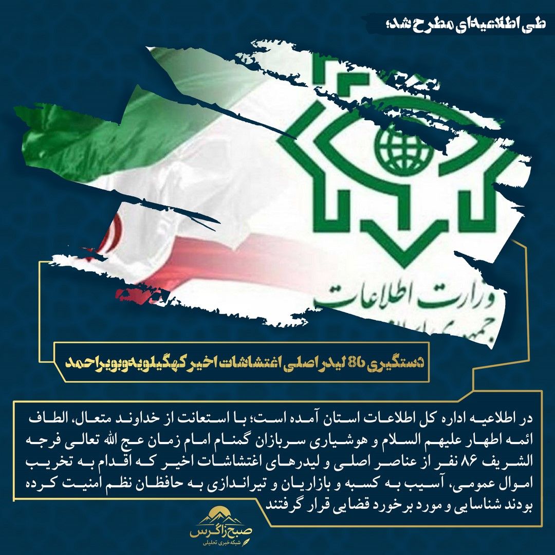 اداره کل اطلاعات کهگیلویه و بویراحمد از شناسایی و دستگیری ۸۶ نفر از عناصر اصلی و لیدرهای اغتشاشات اخیر در استان خبر داد.(اینجا)