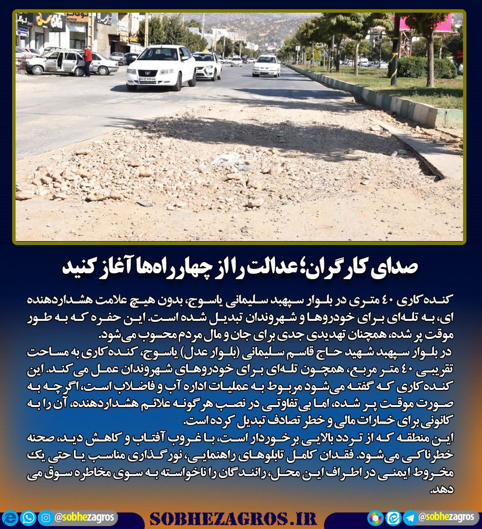 کندهکاری ۴۰ متری در بلوار سپهبد سلیمانی یاسوج، بدون هیچ علامت هشداردهندهای، به تلهای برای خودروها و شهروندان تبدیل شده است. این حفره که به طور موقت پر شده، همچنان تهدیدی جدی برای جان و مال مردم محسوب میشود.(اینجا)