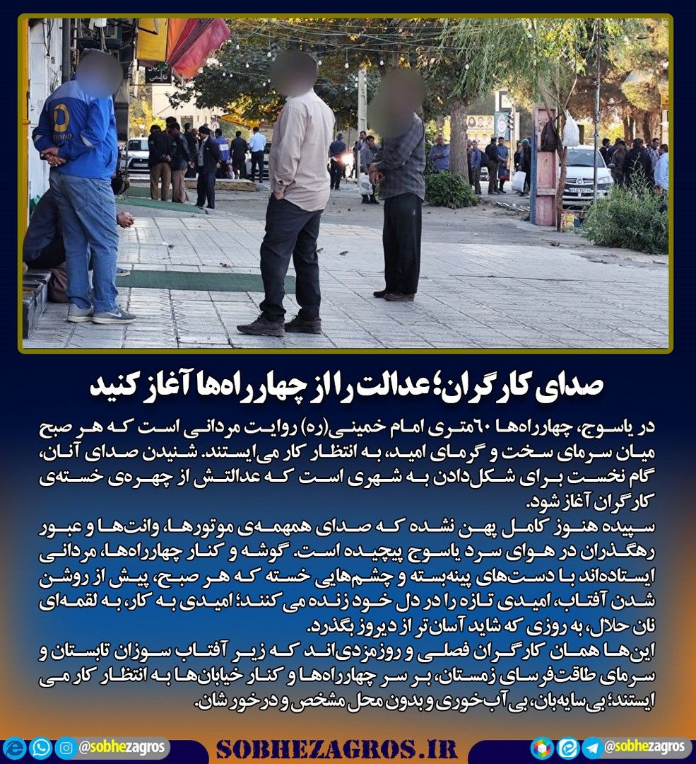 در یاسوج، چهارراهها 60متری امام خمینی(ره) روایت مردانی است که هر صبح میان سرمای سخت و گرمای امید، به انتظار کار میایستند. شنیدن صدای آنان، گام نخست برای شکلدادن به شهری است که عدالتش از چهرهی خستهی کارگران آغاز شود.(اینجا)
