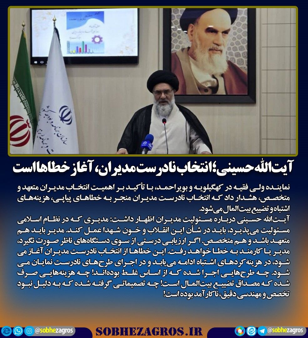 نماینده ولی فقیه در کهگیلویه و بویراحمد، با تأکید بر اهمیت انتخاب مدیران متعهد و متخصص، هشدار داد که انتخاب نادرست مدیران منجر به خطاهای پیاپی، هزینههای اشتباه و تضییع بیتالمال میشود.(اینجا)