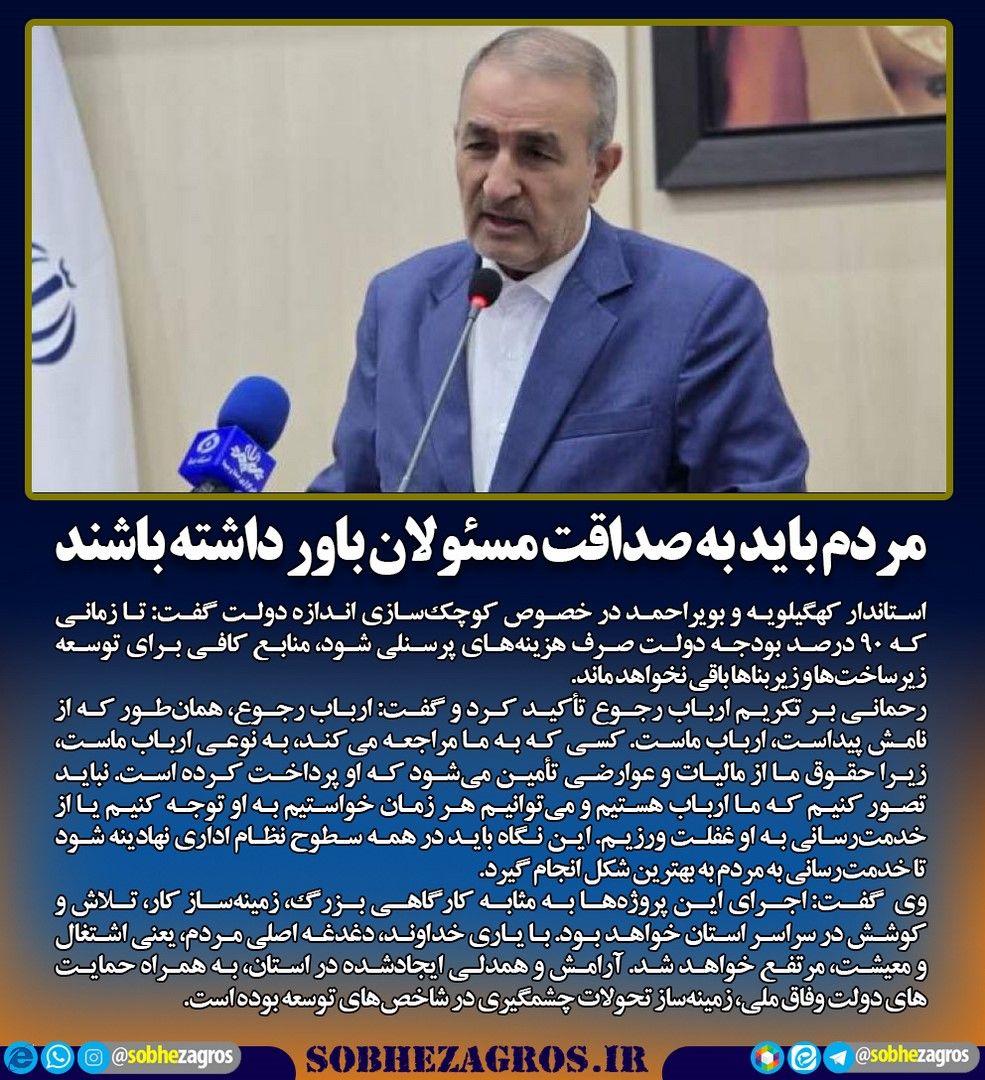 استاندار کهگیلویه و بویراحمد در خصوص کوچکسازی اندازه دولت گفت: تا زمانی که ۹۰ درصد بودجه دولت صرف هزینههای پرسنلی شود، منابع کافی برای توسعه زیرساختها و زیربناها باقی نخواهد ماند.(اینجا)