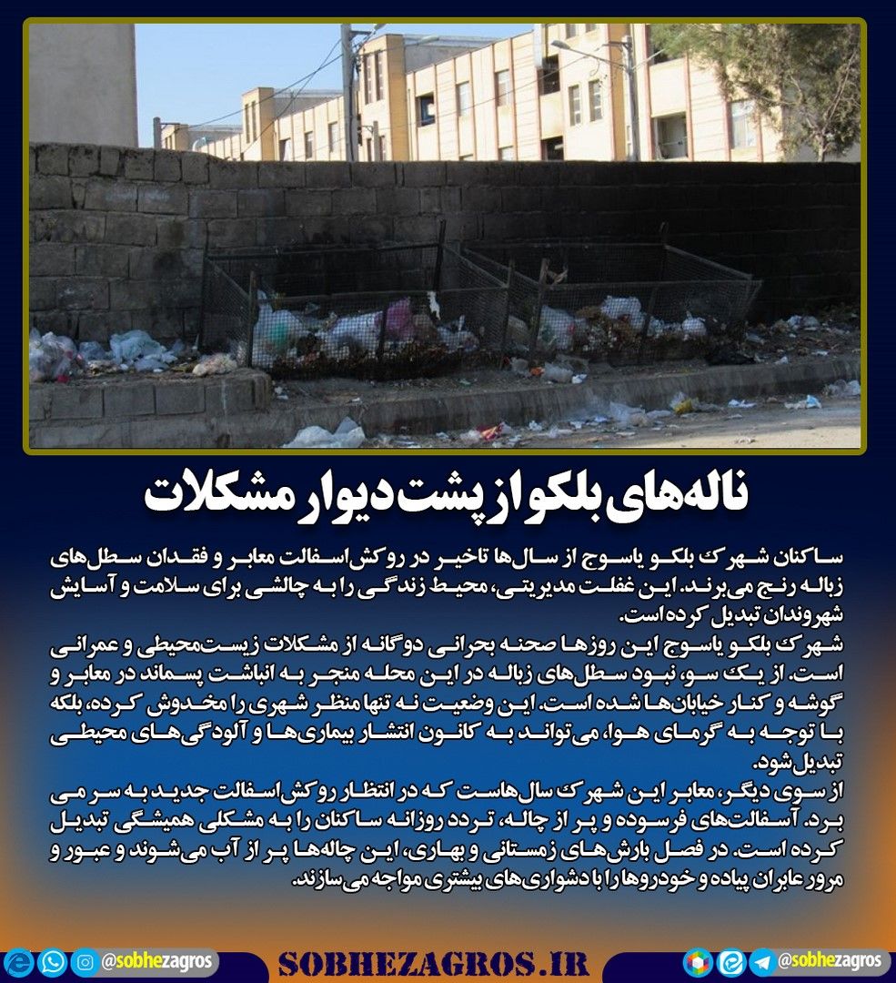 ساکنان شهرک بلکو یاسوج از سالها تاخیر در روکشاسفالت معابر و فقدان سطلهای زباله رنج میبرند. این غفلت مدیریتی، محیط زندگی را به چالشی برای سلامت و آسایش شهروندان تبدیل کرده است.(اینجا)