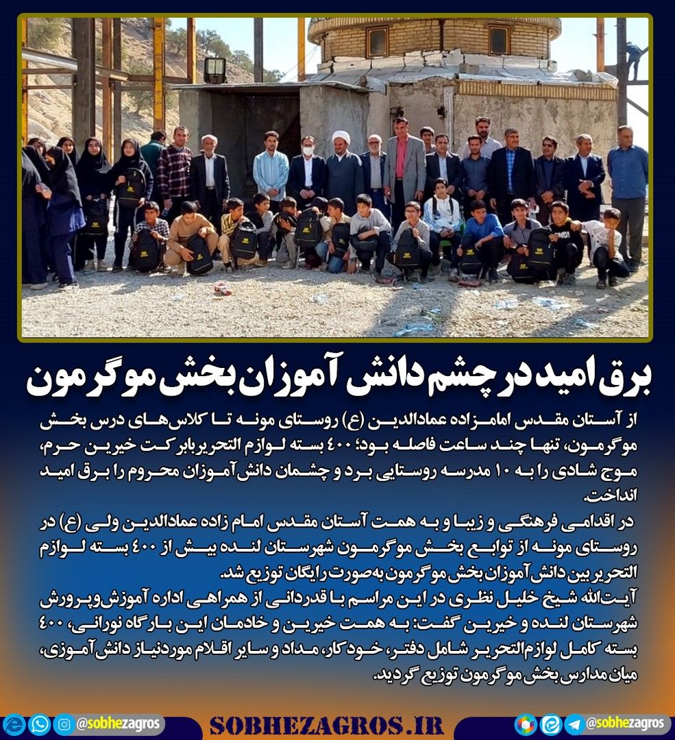 از آستان مقدس امامزاده عمادالدین (ع) روستای مونه تا کلاسهای درس بخش موگرمون، تنها چند ساعت فاصله بود؛ ۴۰۰ بسته لوازم التحریربابرکت خیرین حرم، موج شادی را به ۱۰ مدرسه روستایی برد و چشمان دانشآموزان محروم را برق امید انداخت.(اینجا)