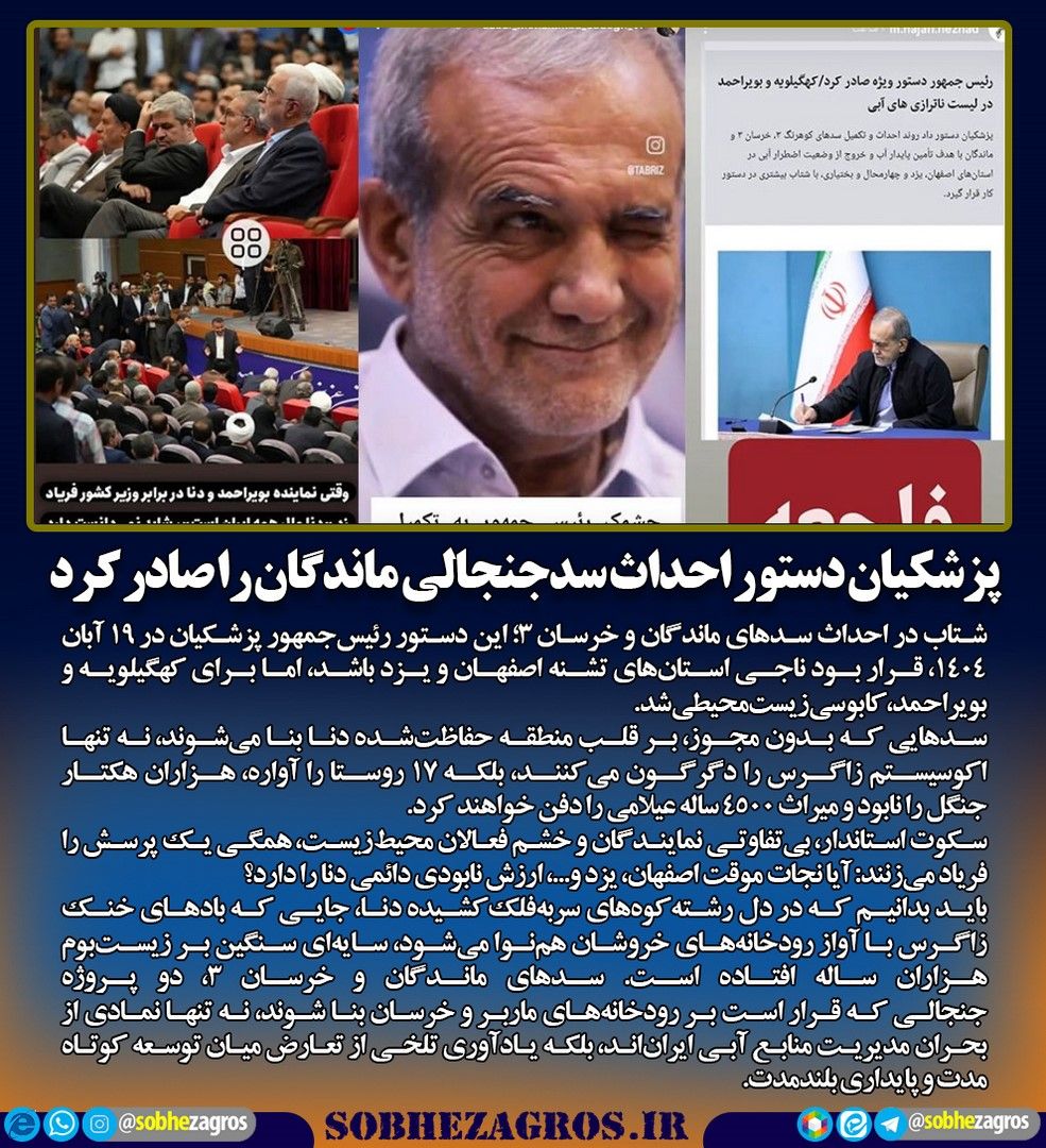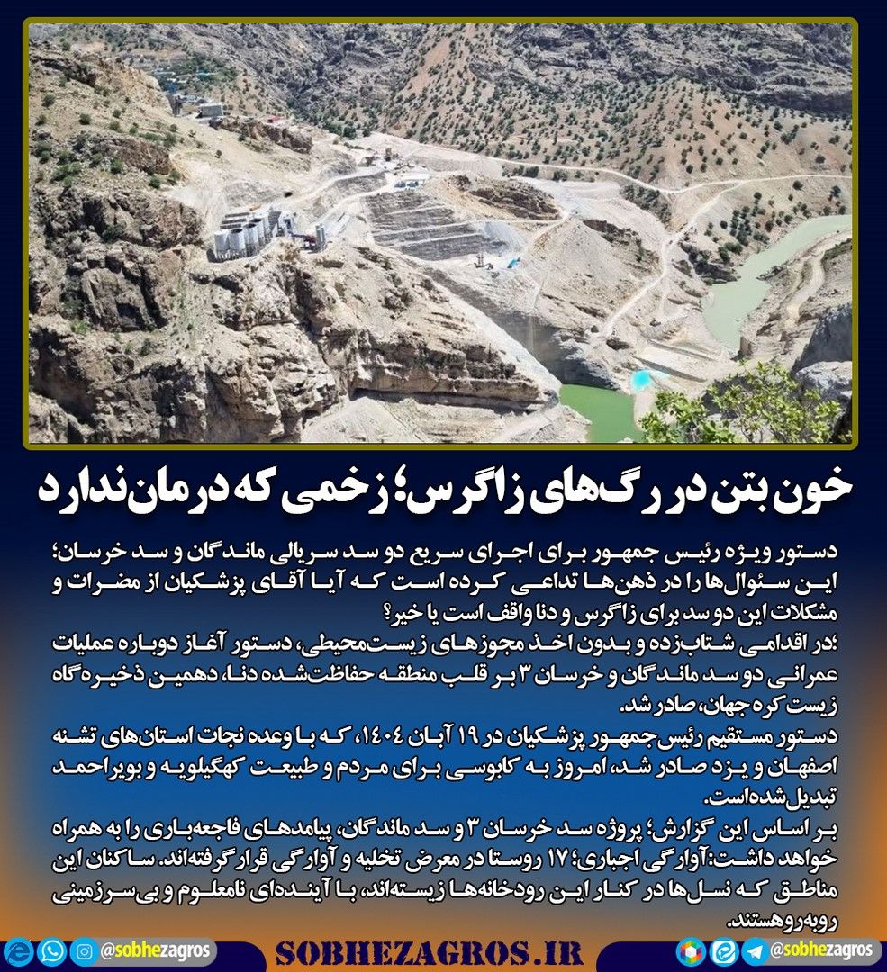 دستور ویژه رئیس جمهور برای اجرای سریع دو سد سریالی ماندگان و سد خرسان؛ این سئوالها را در ذهنها تداعی کرده است که آیا آقای پزشکیان از مضرات و مشکلات این دو سد برای زاگرس و دنا واقف است یا خیر؟(اینجا)
